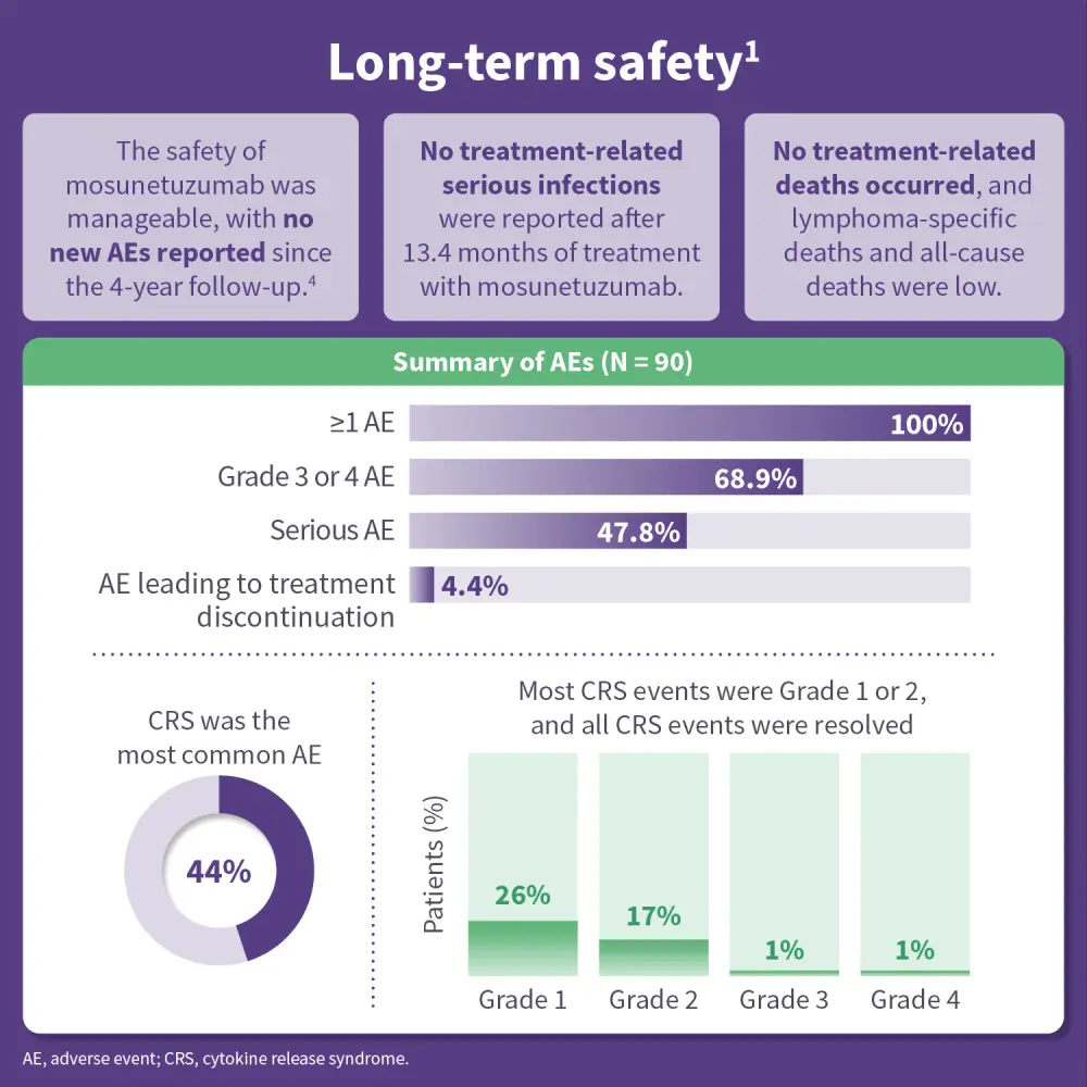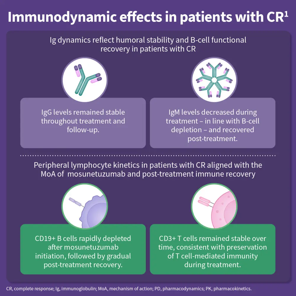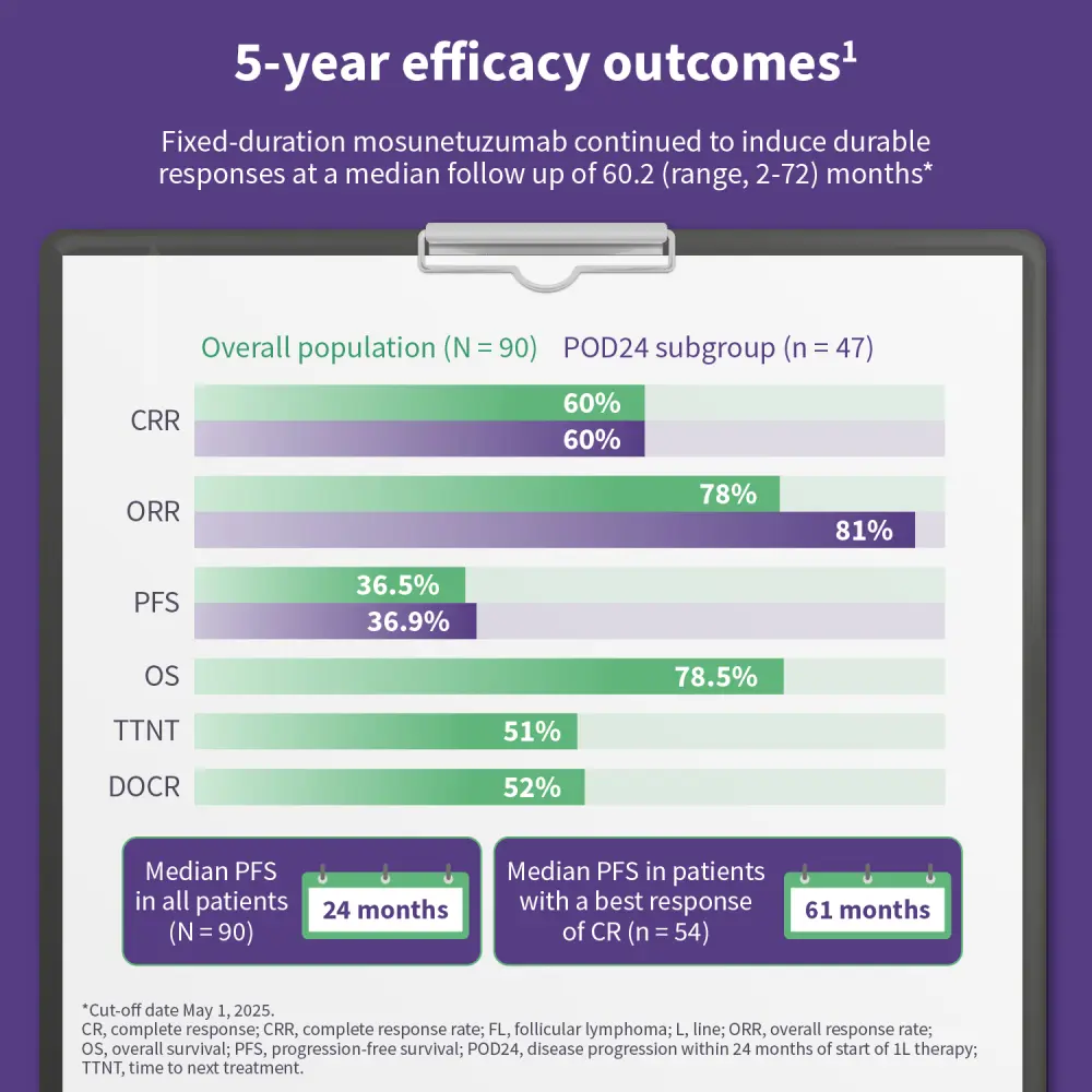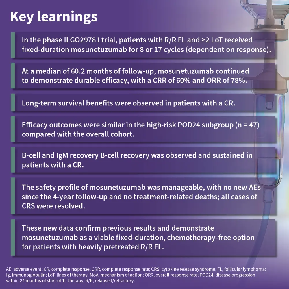 Fixed-duration mosunetuzumab demonstrated durable long-term efficacy in this population, with a complete response rate (CRR) of 60% and overall response rate (ORR) of 78% at a median follow-up of 60.2 months.1 Efficacy outcomes were similar to the whole cohort in high-risk patients who had progressed within 24 months of first-line therapy (POD24).1 In patients with a complete response (CR), median progression-free survival (PFS) was higher (61 months) than in the overall cohort (24 months).1 B-cell and IgM recovery was observed and sustained in patients with a CR, and mosunetuzumab had a manageable safety profile. Fixed-duration mosunetuzumab remains a viable option for heavily pre-treated patients with R/R FL.1