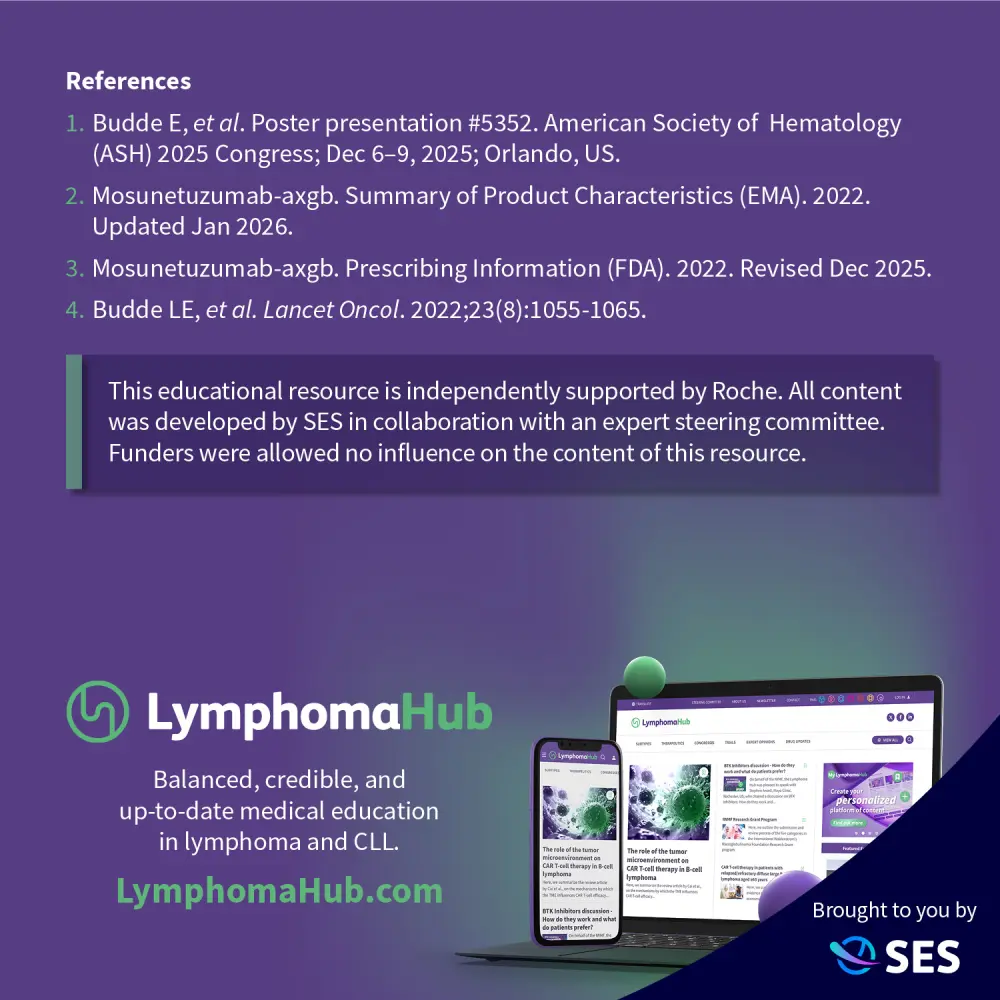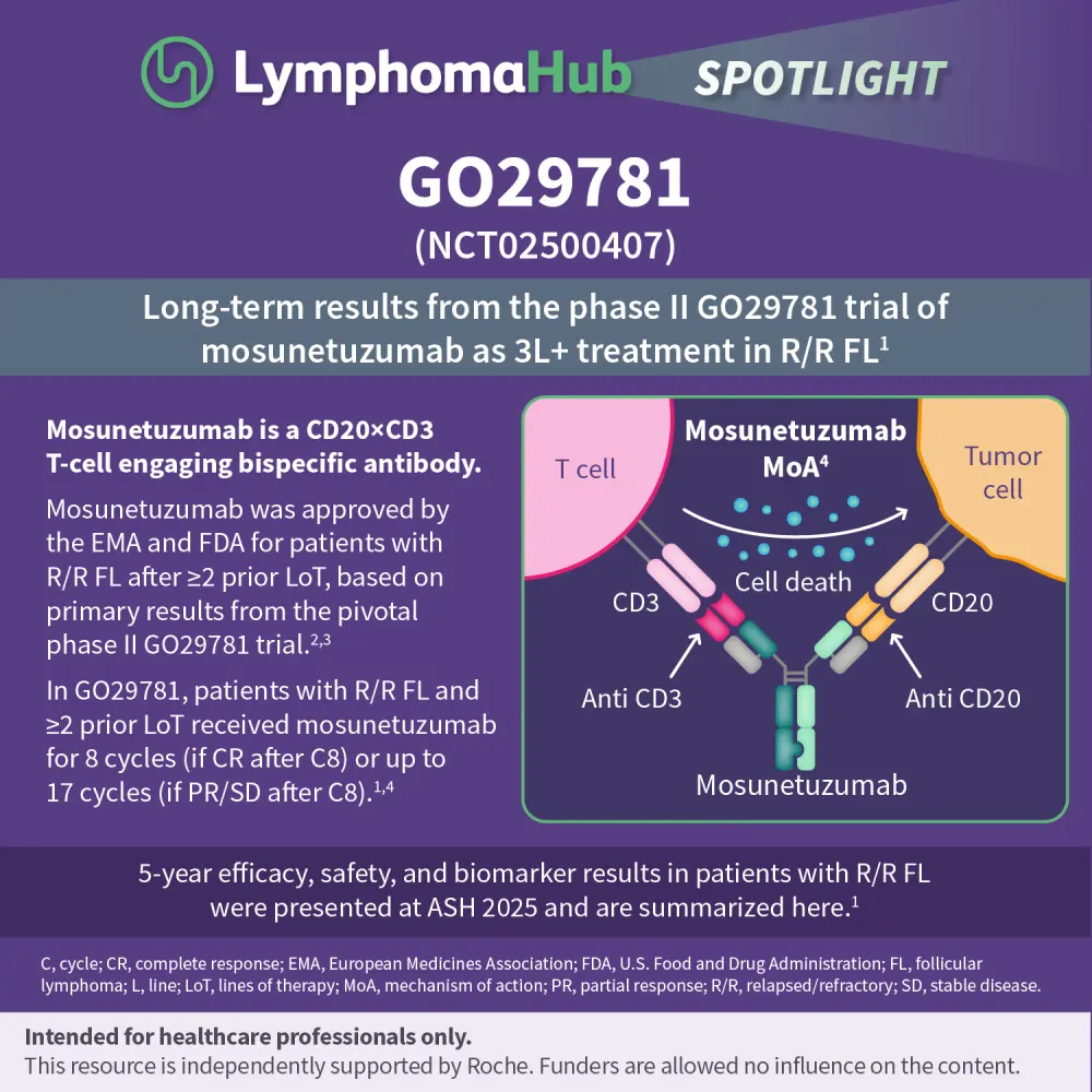 Mosunetuzumab is a CD20xCD3 T-cell engaging bispecific antibody that is approved by the European Medicines Agency (EMA) and the U.S. Food and Drug Administration (FDA) for patients with relapsed/refractory (R/R) follicular lymphoma (FL) who have received ≥2 prior lines of systemic therapy.1–3 Patients with R/R FL received fixed-duration mosunetuzumab for 8 or 17 cycles (dependent on response) in the pivotal phase II GO29781 trial, which met its primary endpoint at a median follow-up of 18.2 months.4 During the 67th American Society of Hematology (ASH) Annual Meeting and Exposition, December 6–9, 2025, Orlando, US, Elizabeth Budde presented 5-year data from the GO29781 trial.1