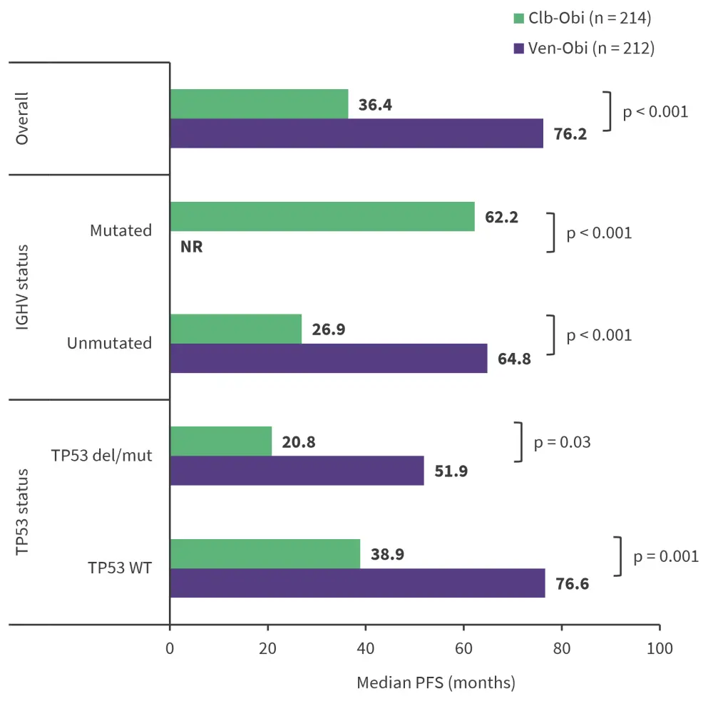 Clb-Obi, chlorambucil plus obinutuzumab; del, deletion; IGHV, immunoglobulin heavy chain variable region; mut, mutation; NR, not reached; PFS, progression-free survival; Ven-Obi, venetoclax plus Obinutuzumab; WT, wild type.