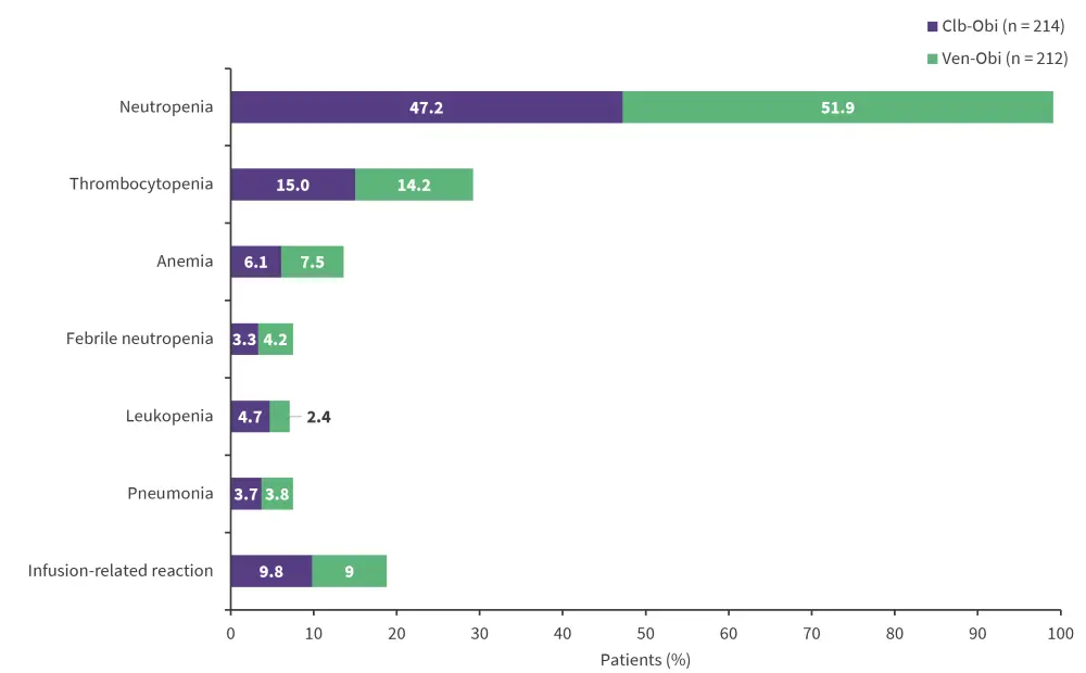 The most common Grade ≥3 adverse events (AEs) during treatment were neutropenia, thrombocytopenia, and infusion-related reactions (Figure 3); there was a very low incidence of these Grade 3 events posttreatment. There were a higher number of overall secondary malignancy events in the Ven-Obi compared with the Clb-Obi arm, with 31 events versus 20 events, respectively, though this difference was not statistically significant.