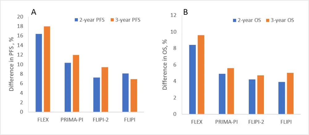 Figure 1. Relative differences in A PFS and B OS between low-risk and high-risk patient groups, defined using FLEX, PRIMA-PI, FLIPI-2, and FLIPI.1