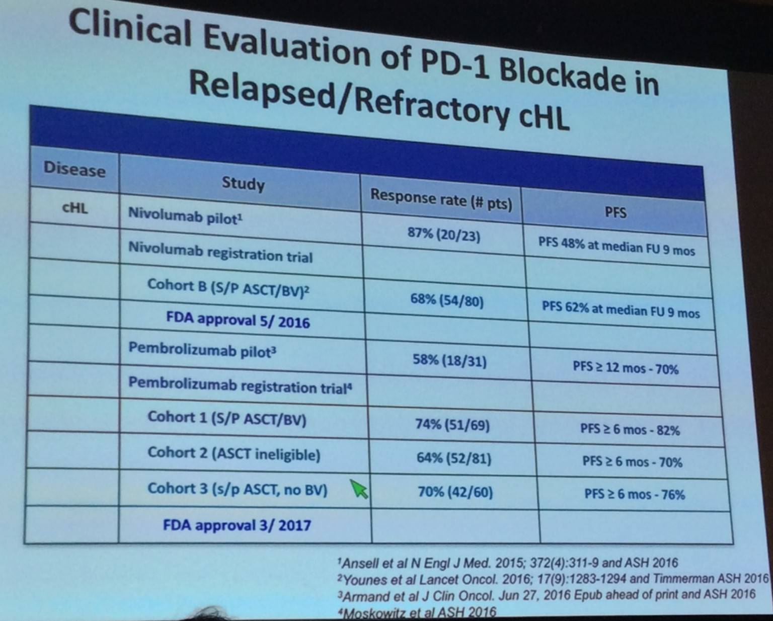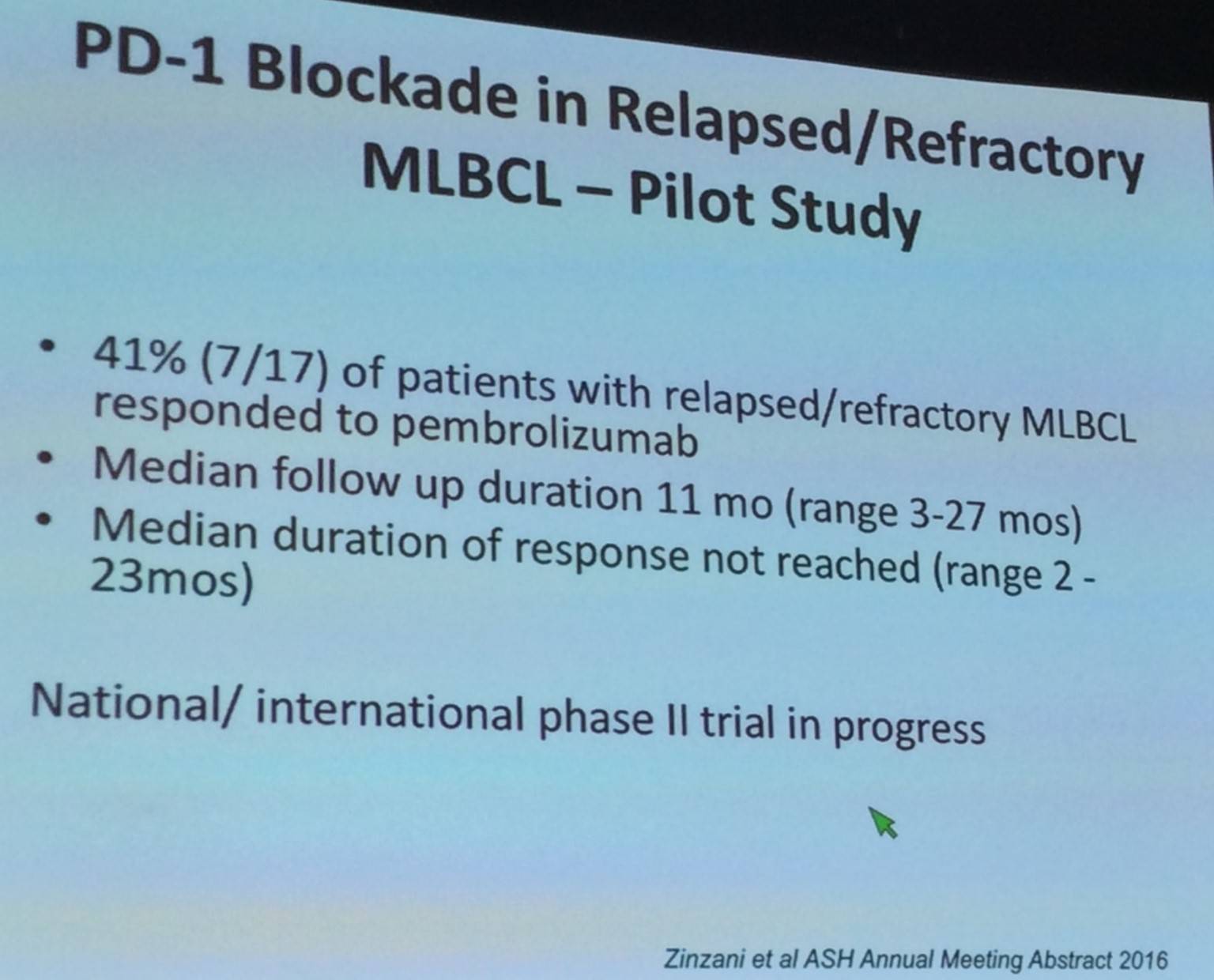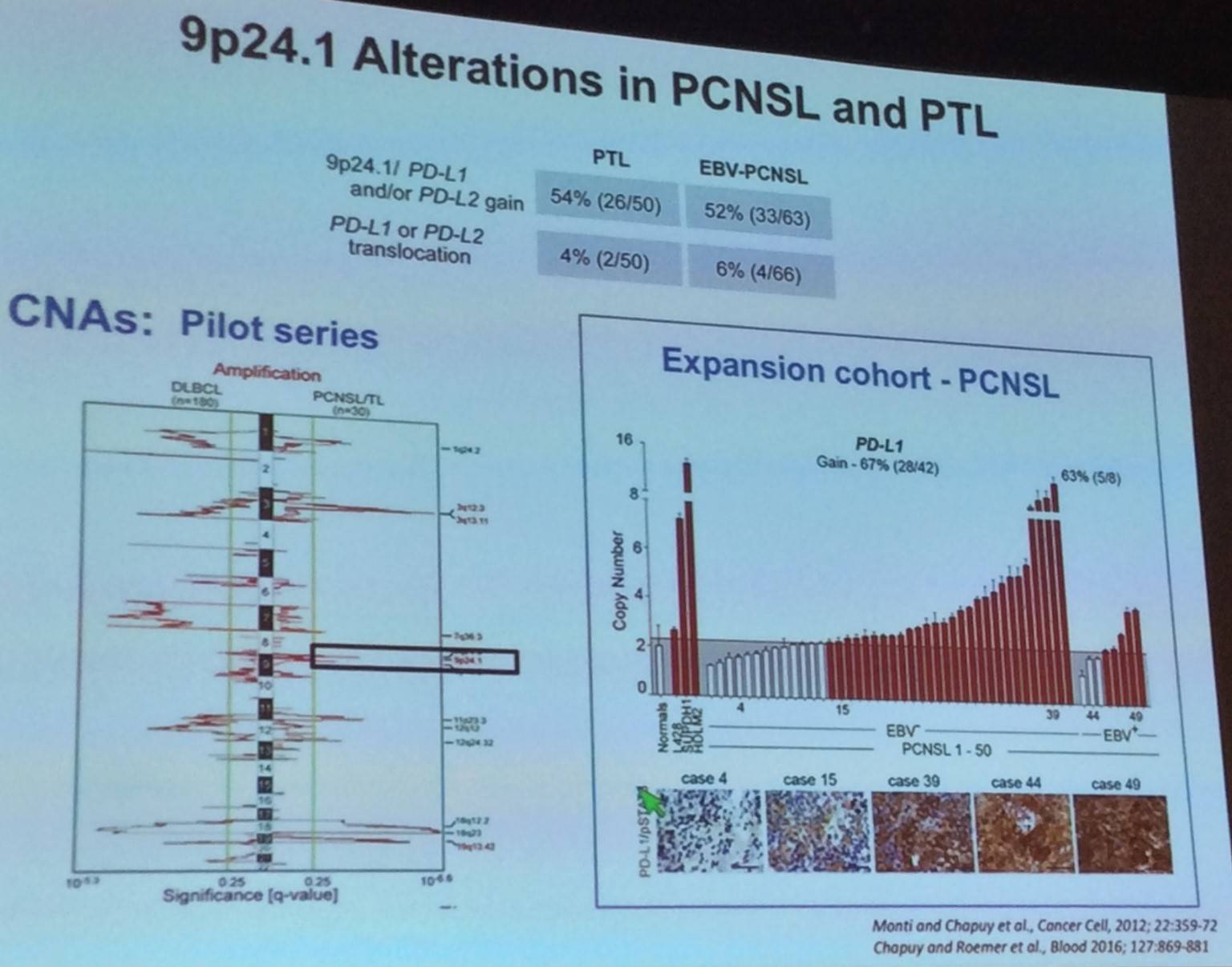 Margaret Shipp also discussed data presented by Zinzani et al. at ASH 2016 of PD-1 blockade in R/R Mediastinal Large B-Cell Lymphoma (MLBCL). 9p24.1 amplification and PD-1L overexpression has been reported in some MLBCL patients (Green et al. Blood. 2010).