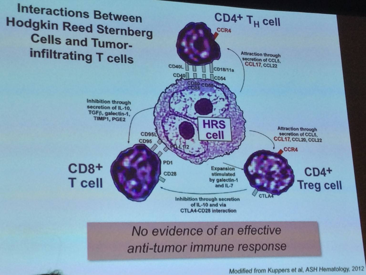 The talk began by discussing Reed-Sternberg (RS) cells, which are crippled CD30+ germinal center B-cells that display genomic instability. They are found in primary cHLs with an extensive inflammatory/immune cell infiltrate.