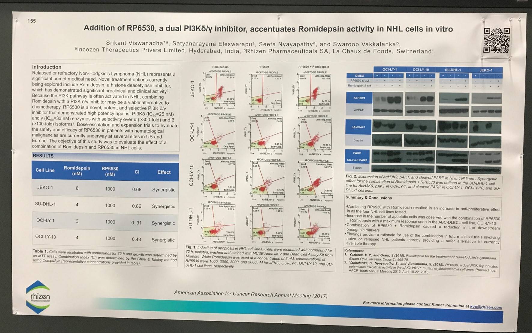 The poster concluded by stating that adding RP6530 increased the activity of romidepsin in NHL cells. This provides a rationale for using this combination in future clinical trials with newly diagnosed or relapsed NHL patients, as it presents a potentially safer alternative to current therapy.