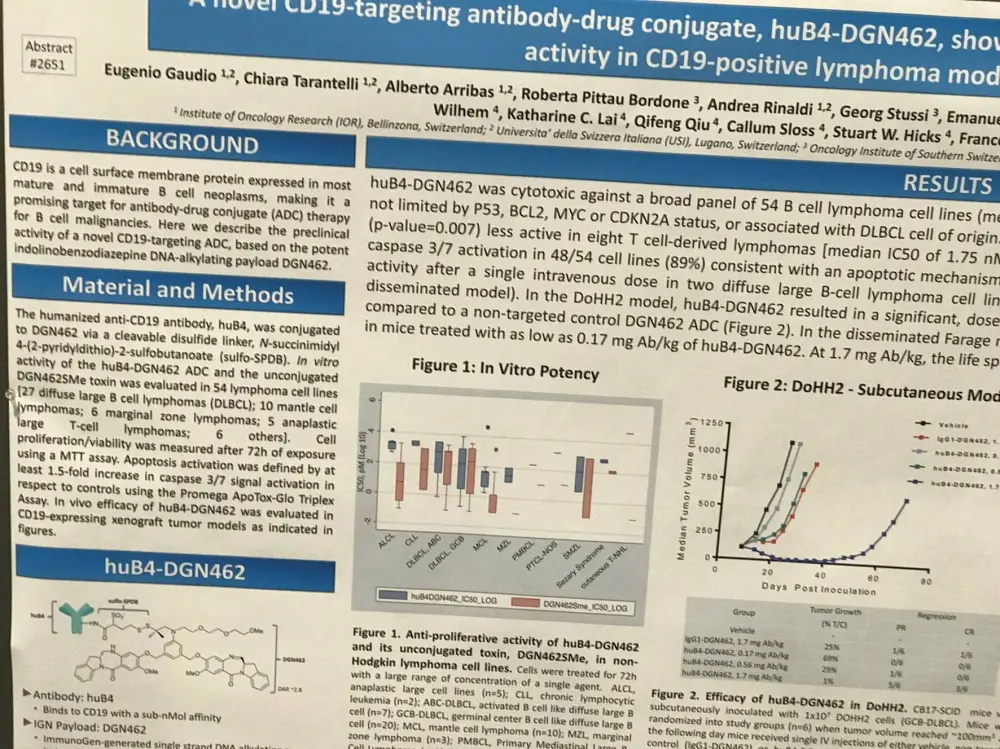 On Monday 3rd April at this year’s American Association for Cancer Research (AACR) annual meeting, a poster (2651 / 10) by Eugenio Gaudio, from the Institute of Oncology Research, Bellinzona, Switzerland, et al. titled “A novel CD19 targeting antibody-drug conjugate, huB4-DGN462, shows promising in vitro and in vivo activity in CD19-positive lymphoma models” was presented.