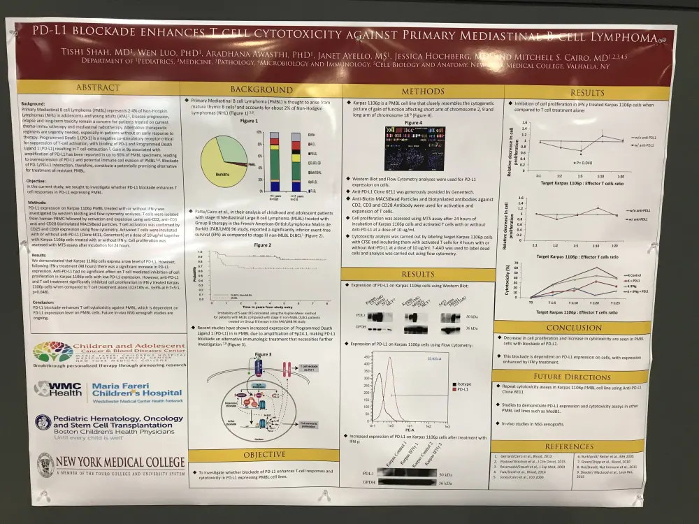 The poster was concluded by stating that T-cell cytotoxicity was heightened by PD-L1 blockade against PMBCL cells. The blockade was dependent on PD-L1 expression, which can be enhanced by administering IFNγ. Future in vivo NSG xenograft studies are ongoing.