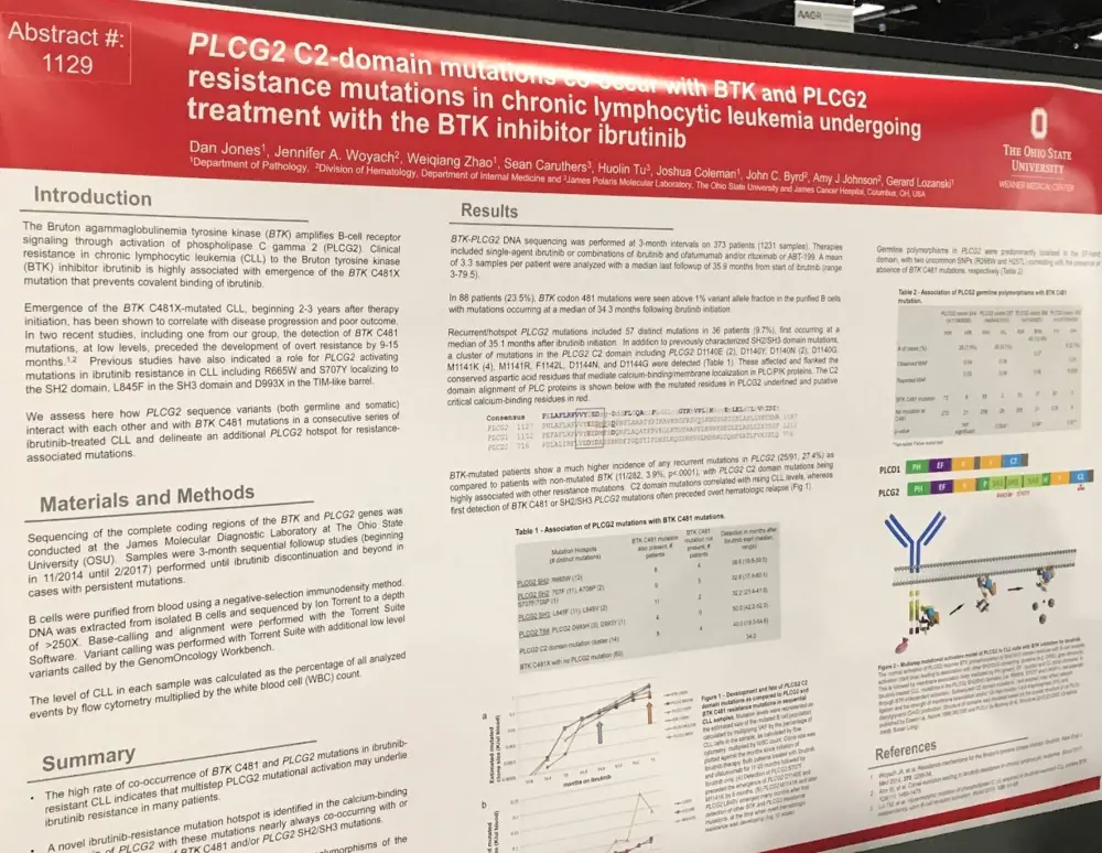One of the posters on display (3150 / 10) was titled “PLCG2 C2-domain mutations co-occur with BTK and PLCG2 resistance mutations in chronic lymphocytic leukemia undergoing treatment with the BTK inhibitor ibrutinib” by Dan Jones from The Ohio State University, Columbus, OH, and colleagues.