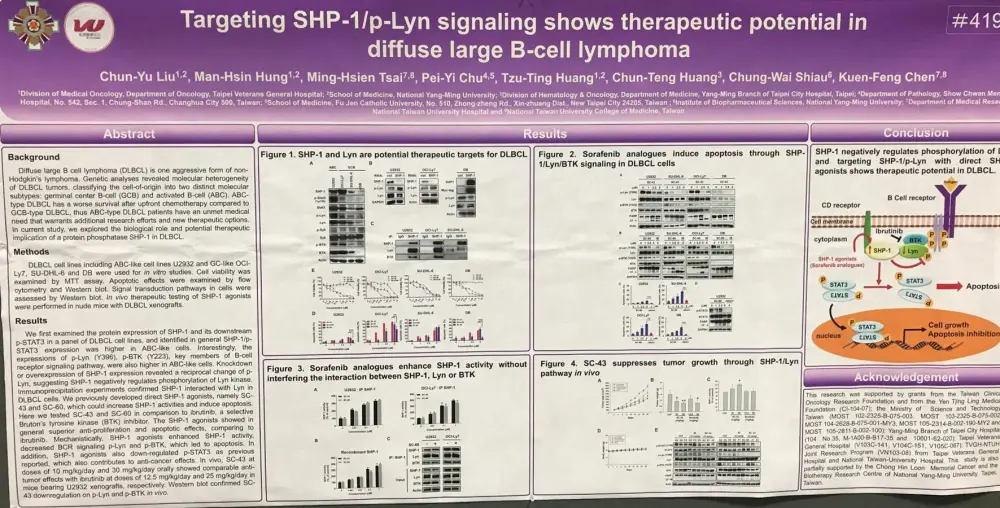 One of the posters on display (4192 / 15) was titled “Targeting SHP-1/p-Lyn signaling shows therapeutic potential in diffuse large B-cell lymphoma” by Chun-Yu Liu from Taipei Veterans General Hospital, Taipei, Taiwan, and colleagues.