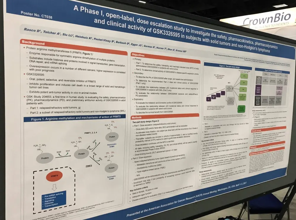 On Monday 3rd April, a poster (CT038 / 14) by Drew Rasco, from South Texas Accelerated Research Therapeutics, San Antonio, TX, et al. titled “A phase I, open-label, dose-escalation study to investigate the safety, pharmacokinetics, pharmacodynamics, and clinical activity of GSK3326595 in subjects with solid tumors and non-Hodgkin's lymphoma” was presented.