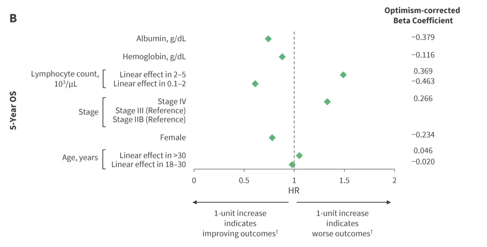 Figure 1. Optimism-corrected HRs for A 5-year PFS and B 5-year OS multivariable prediction models*