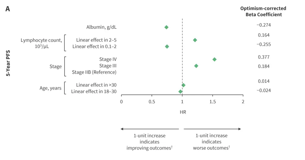 The primary outcomes were 5-year PFS and OS. Baseline predictors were sex, stage (IIB, III, IV), B symptoms, any bulk (by trial/registry definition), histology, age at diagnosis, white blood cell count, absolute lymphocyte count (ALC), hemoglobin, albumin, and erythrocyte sedimentation rate.