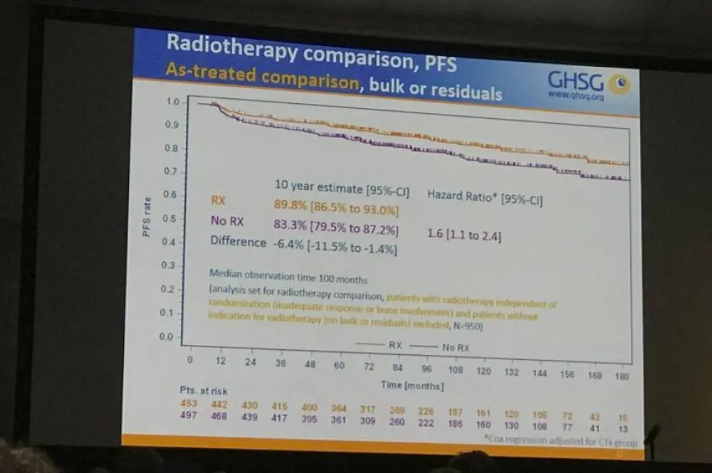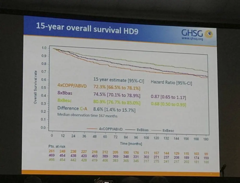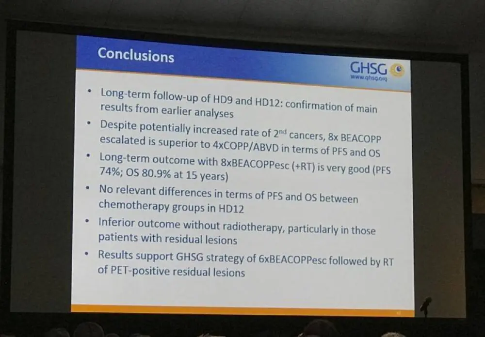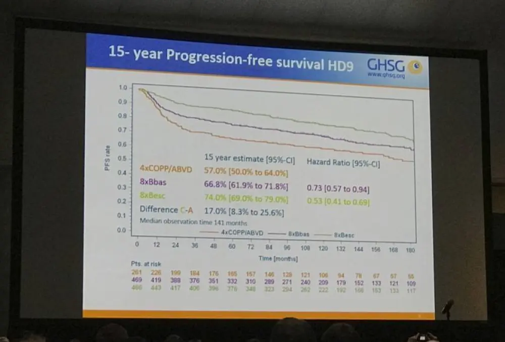 Bastian von Tresckow concluded that intensive first-line treatment, such as BECAOPPescalated, increases the 15 year OS and PFS of newly diagnosed advanced HL patients, and that consolidating RT provides a benefit to 10 year OS and PFS.