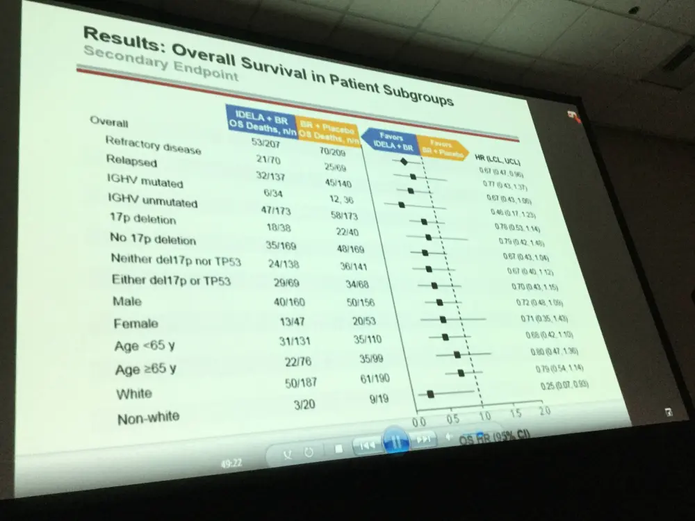 Abstract #231 was presented during this session, titled “Updated Analysis of Overall Survival in Randomized Phase-III Study of Idelalisib in Combination with Bendamustine and Rituximab in Patients with Relapsed/Refractory CLL” by Andrew D. Zelenetz, MD, PhD, of the Memorial Sloan Kettering Cancer Center, New York, and colleagues.