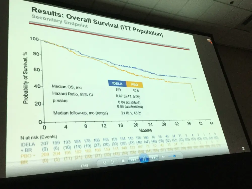 This abstract presented updated data on Overall Survival (OS) of a phase III, double-blind, randomized, placebo-controlled study (NCT01569295) aimed at evaluating the safety and efficacy of idelalisib plus bendamustine and rituximab for patients with previously treated CLL.
