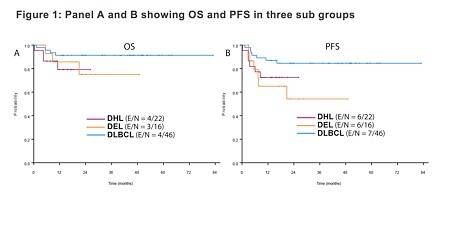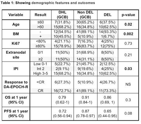 Two-hundred and thirty-three high-risk patients with DLBCL, treated with (DA) EPOCH-R, were identified. Patients in the DHL were more likely to have bone marrow involvement, and the DEL and DHL groups were more commonly aged over 60 years and had higher IPI scored compared to the non DEL GCB group. 1-year OS, PFS and CR rate were not significantly different between the three subgroups (figure 1).