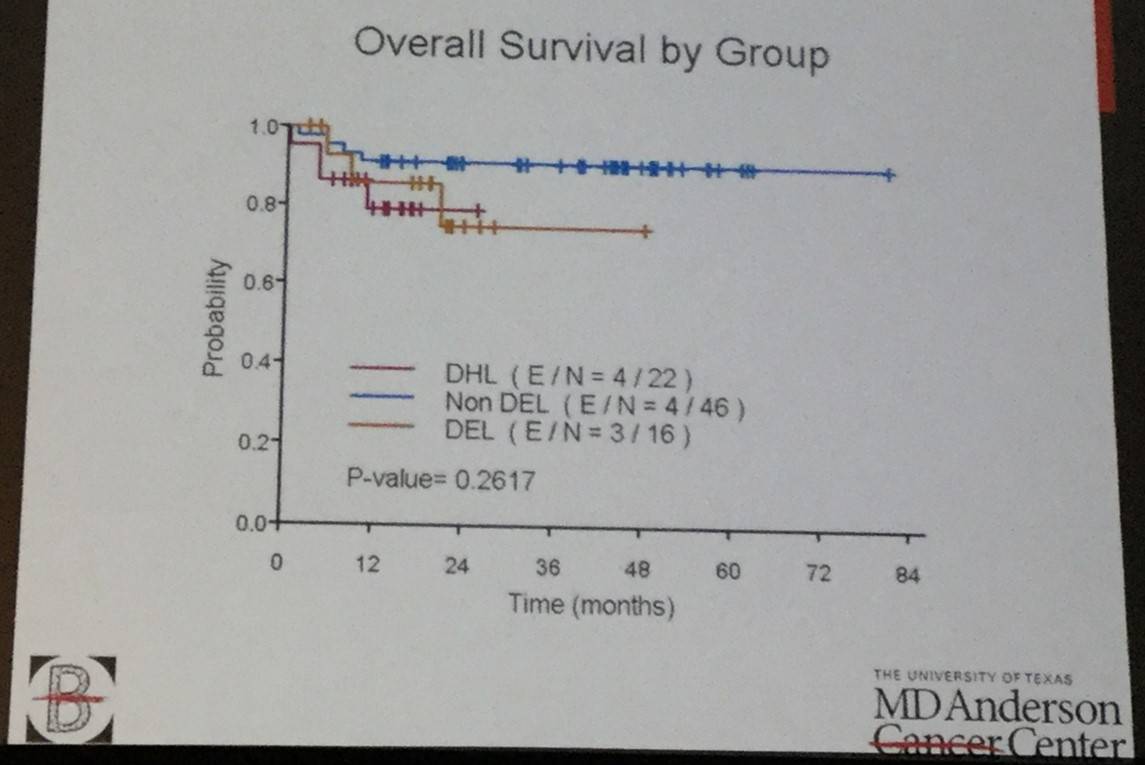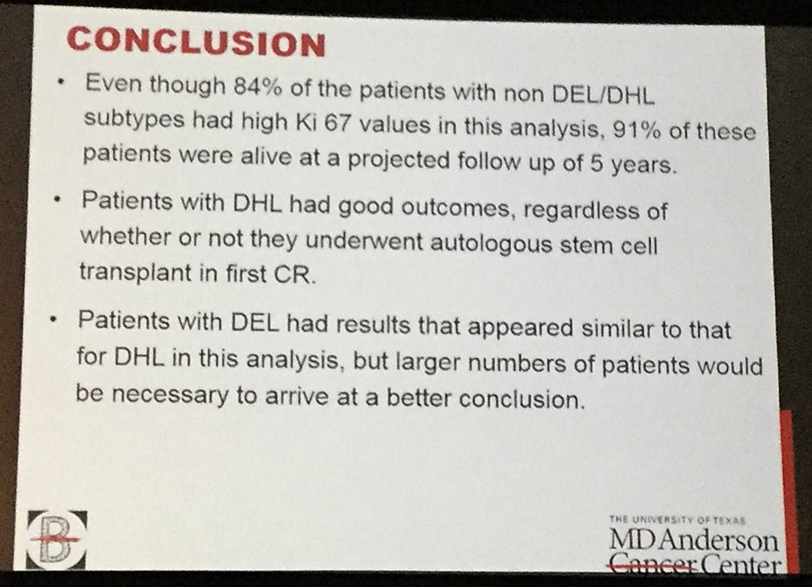 This talk concluded by stating that the results of this retrospective study indicated that OS in DHL, DEL and non DEL DLBCL are not statistically different and so intensive chemotherapy could be considered as an alternative frontline treatment option for patients with high-risk DLBCL. However, future randomized trials need to be conduction to confirm this.