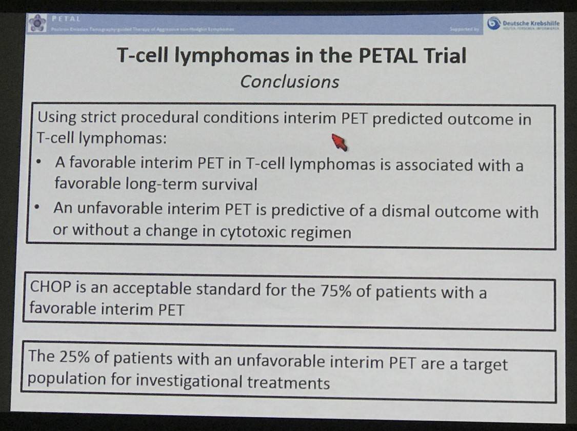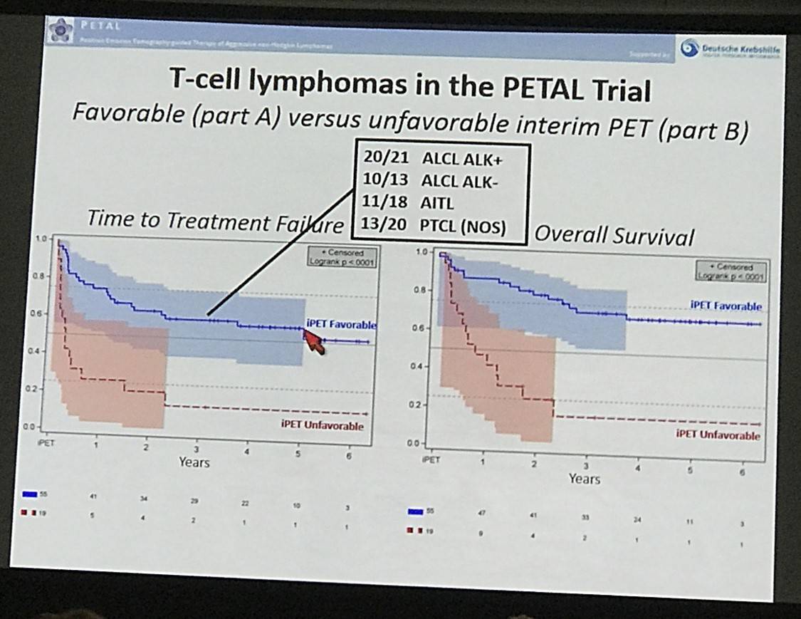 The 58th Annual Meeting & Exposition of the American Society of Hematology’s (ASH) took place in San Diego, CA, and on December 3rd, Andreas Hüttmann, MD, from University Hospital Essen, Germany, presented analysis of peripheral T-cell lymphoma patients recruited to the PETAL trial. The PETAL trial concluded that while treatment changes based upon interim-PET had no impact on outcome, it was reliable at predicting OS and time to treatment failure (TTTF).