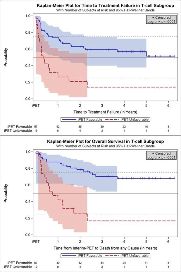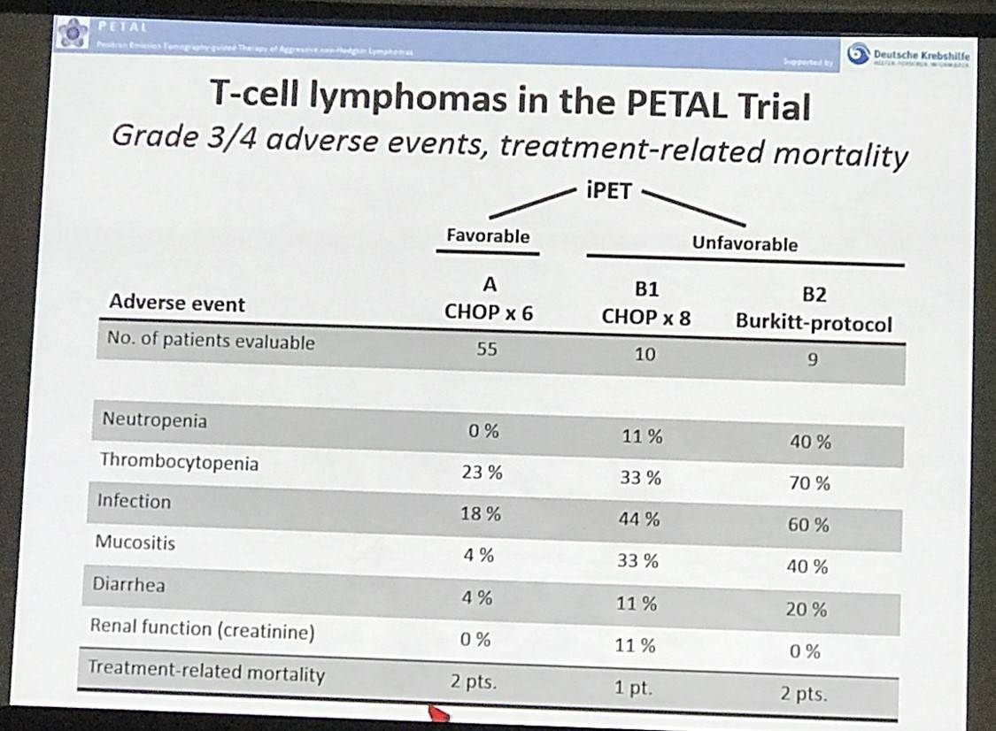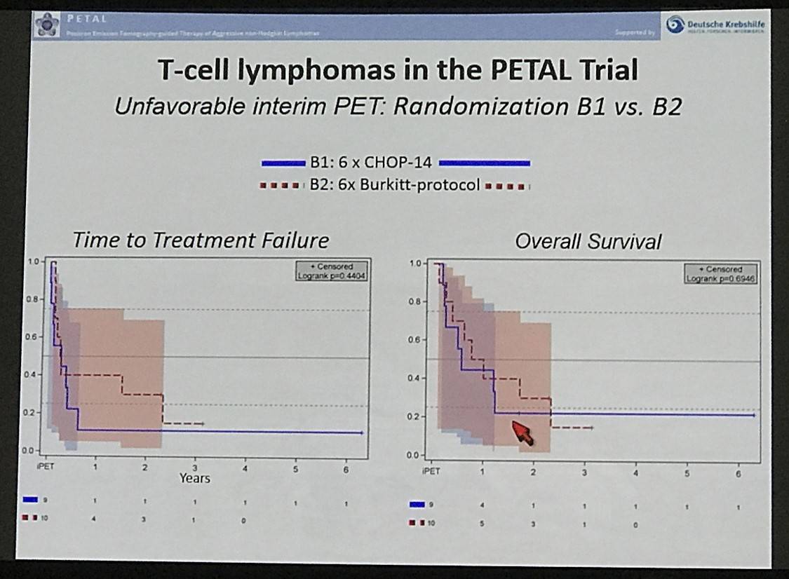 From 1072 patients recruited to the PETAL trial, there were 76 patients with T-cell lymphomas of which 21 were ALK positive ALCL, 13 ALK negative ALCL, 18 with AITL, and 20 unspecified PTCL. Treatment regimen is described in the abstract, but briefly was 2 cycles of R-CHOP after a positive baseline PET result, CD20 patients did not receive rituximab but did receive four extra cycles of CHOP following favorable iPET (defined as Part A/favorable iPET). Different treatment arms were defined after iPET with unfavorable iPET response treatment being either 6 more cycles of CHOP or a complex 6 five day chemotherapy cycles with a complex of cytarabine, methotrexate, and etoposide treatment schedule (Part B/iPET unfavorable).