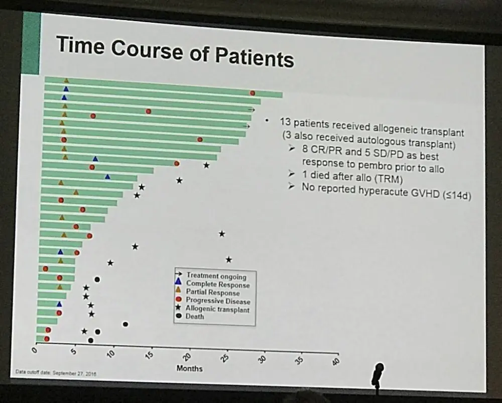 Conclusions: With nearly 2.5 years of median follow-up, the present results demonstrate that a subset of heavily pretreated patients who failed BV therapy can achieve a long-term response with single-agent pembrolizumab, without consolidative therapy. PD-1 blockade may offer a new treatment paradigm for patients with relapsed/refractory cHL, supporting the hypothesis that this tumor has a genetic dependence on the PD-1 pathway.