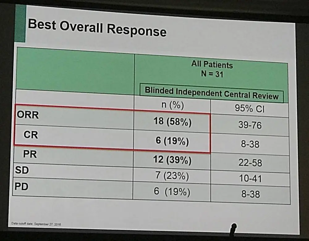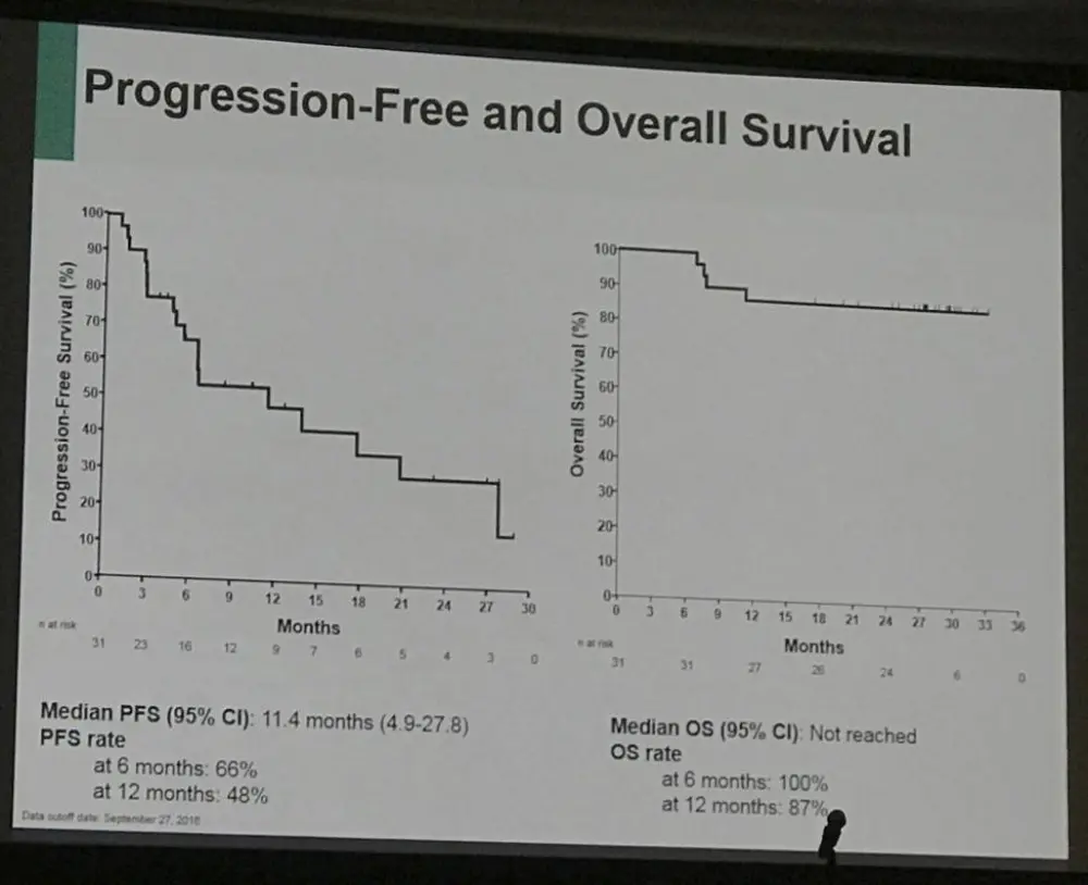 An analysis with hierarchical mutually exclusive categories of refractory disease (RD; defined as no response to ≥1 prior line of therapy) or relapse after ≥3 prior lines of therapy (Re ≥3) was conducted. Per BICR, the ORR was 56% in RD (n = 27 patients) and 75% in Re ≥3 (n = 4). As of the data cutoff date, 3 patients (10%) remained on treatment, 5 (16%) completed 2 years of treatment, and 23 (74%) discontinued treatment: 3 (10%) for toxicity, 14 (45%) for progressive disease, 3 (10%) per physician decision (all ultimately underwent allogeneic SCT), 1 in CR (underwent allogeneic SCT), 1 for clinical progression, and 1 who withdrew consent. Per BICR, median progression-free survival (PFS) was 11.4 months; 6-month and 12-month PFS rates were 66% and 48%, respectively. Median overall survival (OS) was not reached; 6-month and 12-month OS rates were 100% and 87%, respectively.