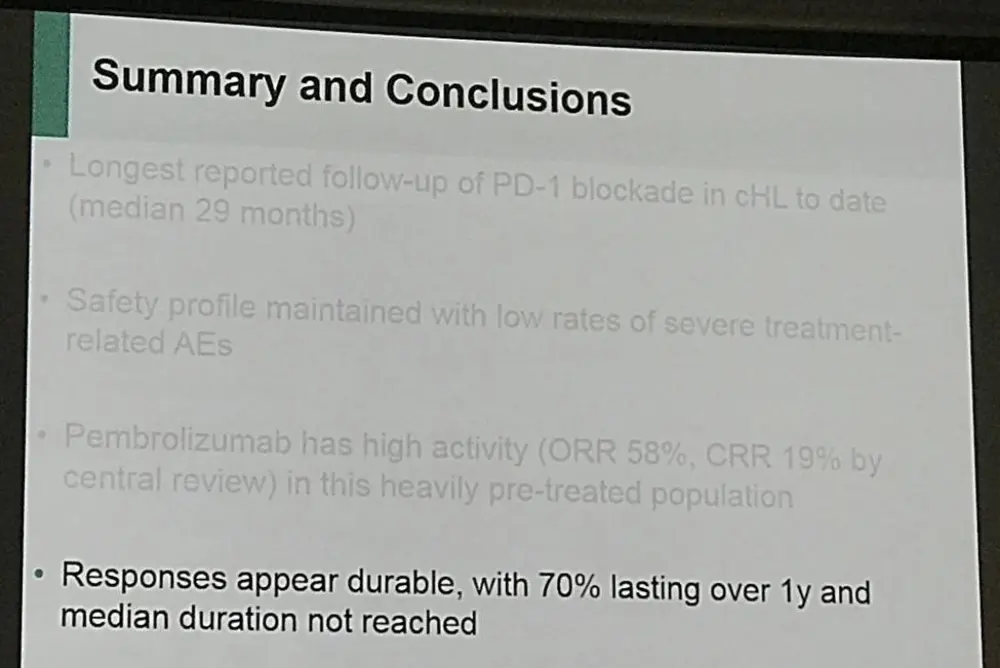 The presentation concluded by stating that these results indicate that heavily pre-treated cHL patients who have failed treatment with BV can achieve long-term responses with single-agent pembrolizumab without consolidative therapy. It is highlighted that, due to this tumor’s genetic dependence on the PD-1 pathway, PD-1 blockade may offer a new treatment paradigm patients with R/R cHL.