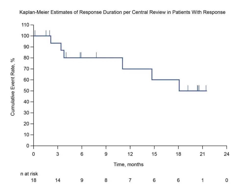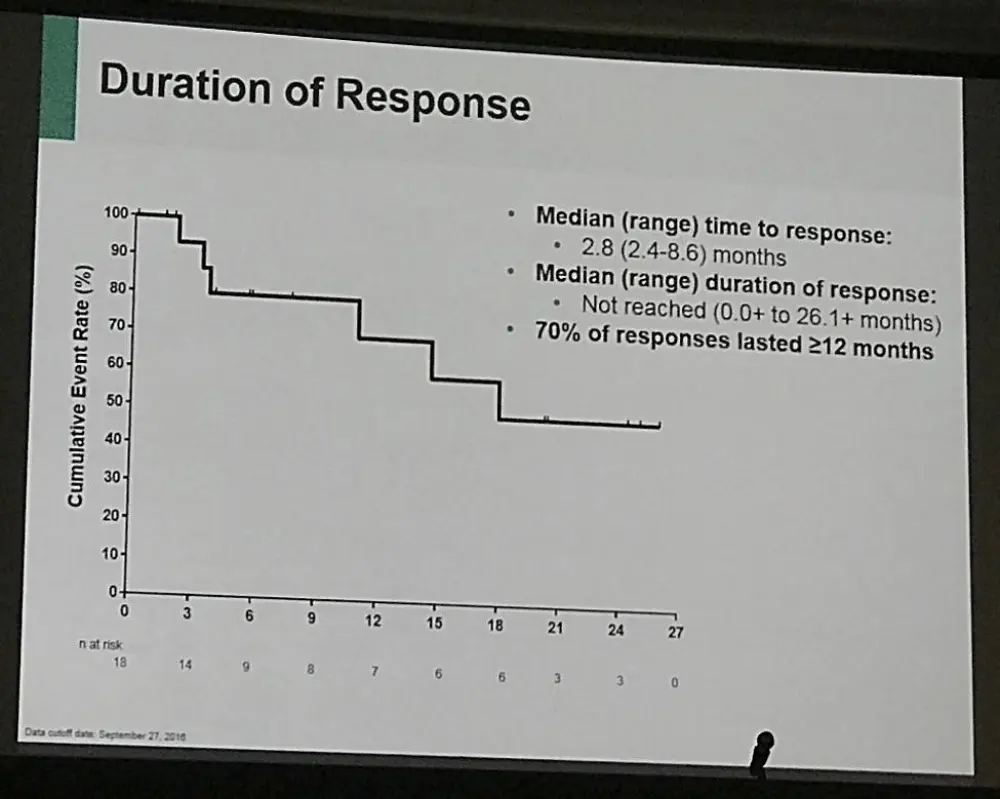 Results: At the time of data cutoff on June 3, 2016, 31 patients were enrolled, and all were evaluable for analysis. Median follow-up duration was 24.9 months (range, 7.0-29.7 months). The median number of prior lines of therapy was 5 (range, 2-15), 74% of patients had failed prior ASCT, and by design 100% had failed prior BV. Per investigator review, ORR was 65%, and CRR was 19%. Per BICR, ORR was 58% (18/31), with 6 patients (19%) achieving CR and 12 (39%) partial remission; 7 patients (23%) had stable disease as their best response. Median DOR was not reached, with a range of 0.0+ to 21.4+ months (95% CI, 3.7 months to not reached) (Figure).