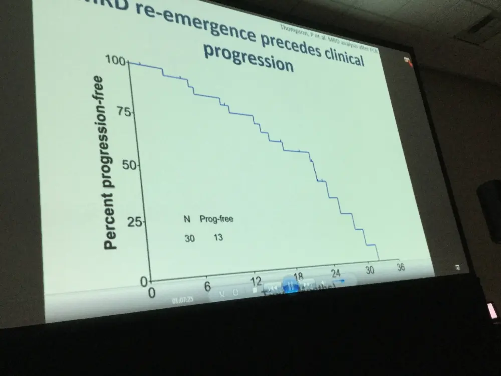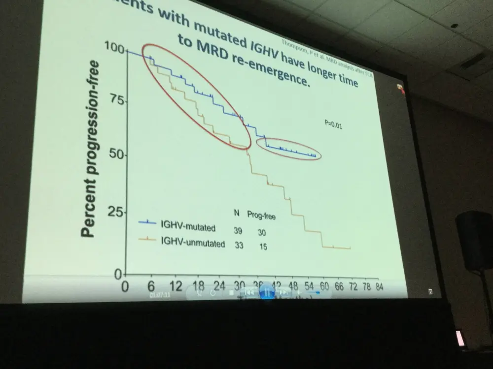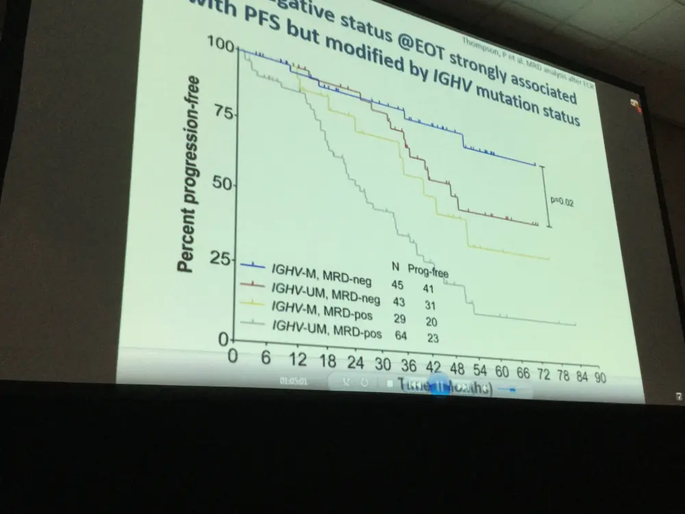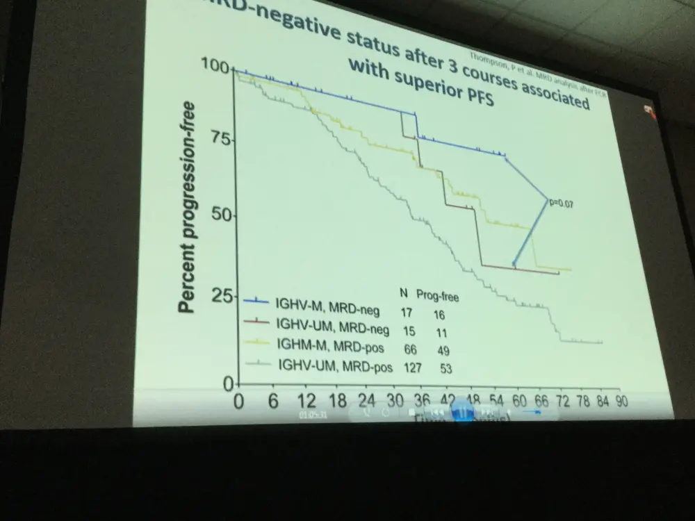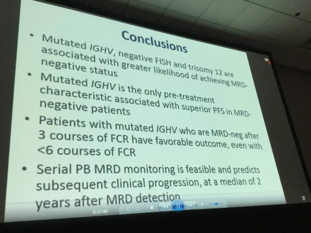 This presentation concluded by stating that in patients receiving FCR as first-line therapy, the best pre-treatment predictor of obtaining MRD-negativity and longer PFS was IGHV-M. IGHV-M patients who achieved MRD negative disease after 3 courses of FCR had particularly favorable outcomes, even after abbreviation of therapy. Despite achieving MRD-negative disease, many patients relapsed. It was recommended that serial MRD monitoring of peripheral blood can detect relapse with a lead-time of approximately 2 years and therefore direct early intervention strategies.