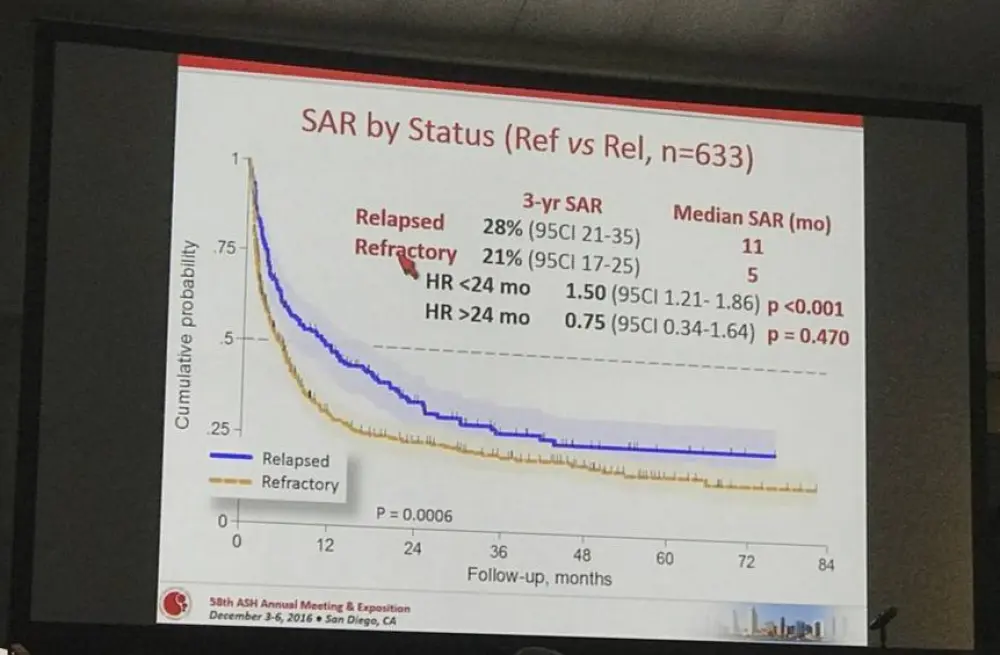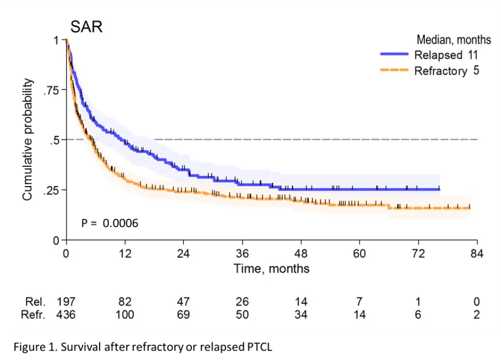 Results: Of the 1020 cases reviewed, 83 (8%) received palliative treatment and were excluded from this analysis. Out of 937 who received an active treatment (92%), 436 were classified as Ref (47%) and 197 as Rel (21%). Median time to relapse was 8 months (range 2-73 months). Overall, 77%, 73%, 59% and 45% of PTCL-NOS, AITL, ALCL alk- and ALCL alk+ were Rel/Ref, respectively. Forty-four percent of the pts were at high-risk according to PIT and 45% according to IPI. All but 3 pts received combination chemotherapy and 34 (5%) were consolidated with high dose therapy (HDT) in first remission. Additionally, 99 (16%) pts received HDT as part of salvage treatment. After a median follow-up from documentation of Rel/Ref disease of 38 months (range 1-96 months), 440 patients had died. The median survival after Rel/Ref disease (SAR) was 5.8 months (95% CI 4.9-7.2 months). At 3 years, the SAR was 28% for Rel (95% CI 21-35%) and 21% (95% CI 17-25%) for Ref (p<0.001) (Figure 1). Patients responding to salvage therapy and consolidated with autologous stem cell transplantation (ASCT) had a 3 year SAR of 48% (95% CI 37-58) with an HR of 0.36 (95% CI 0.26-0.48) compared to pts not treated with HDT (p<0.001). In a univariate Cox regression analysis, Ref disease was associated with a higher risk of death (HR=2.14, 1.69-2.69, p<0.001), whereas late relapse (>12 months, HR 0.54, 95% CI 0.39-0.75, p<0.001) and salvage therapy with ASCT (HR=0.35, 95% CI 0.26-0.48, p<0.001) were associated with a better outcome. No difference was found in outcomes for Rel/Ref pts with respect to histology.