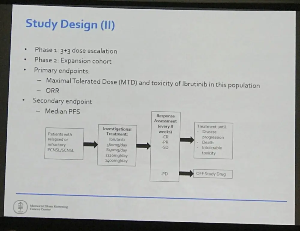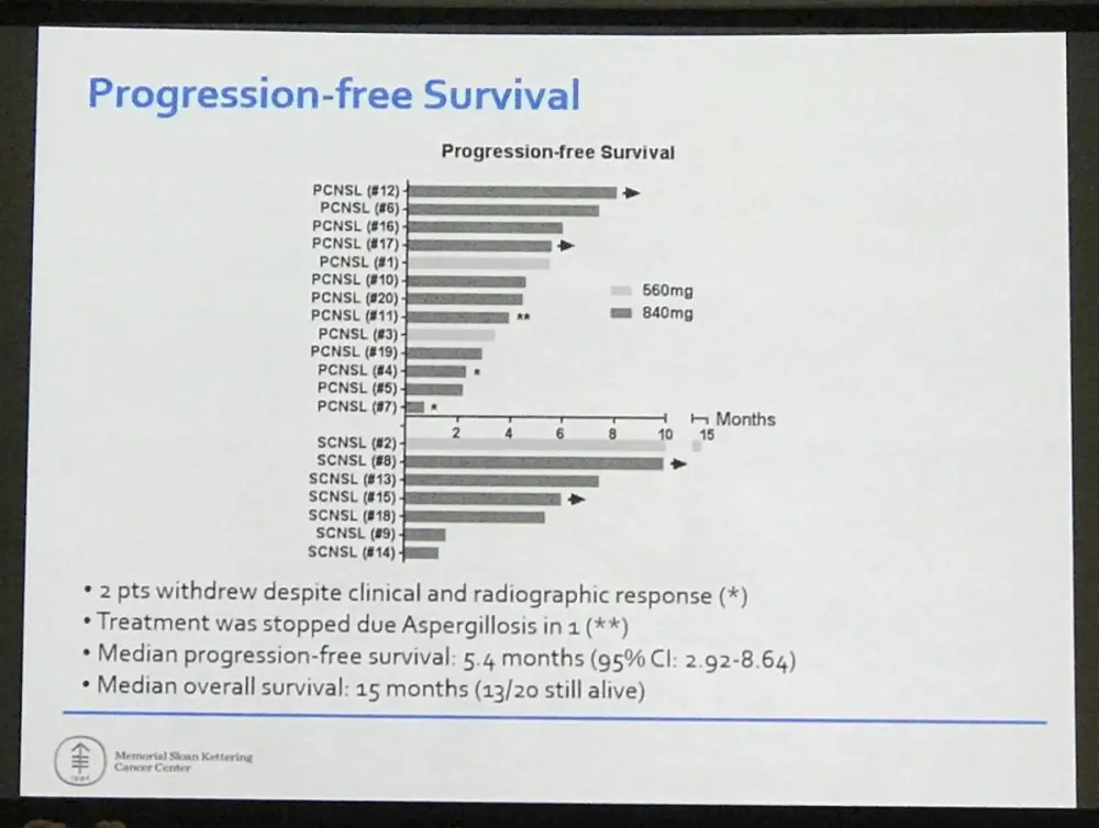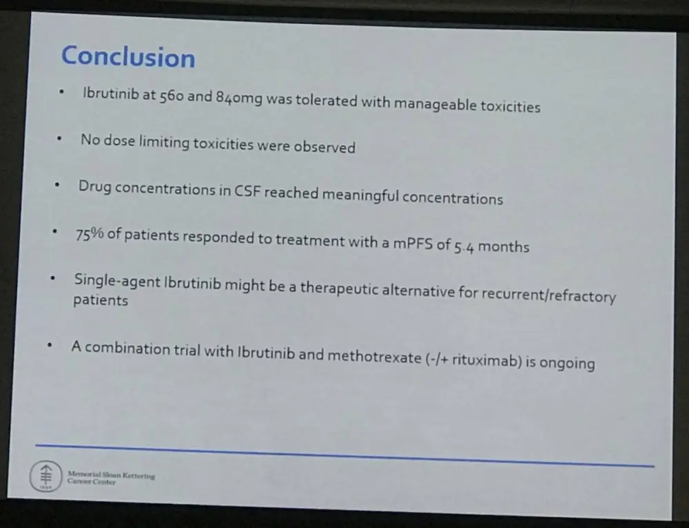 This abstract presentation concluded by stating that ibrutinib treatment is well tolerated in patients with Primary and Secondary CNS Lymphomas who experienced manageable AEs. A combination trial of ibrutinib plus methotrexate with or without rituximab is ongoing.