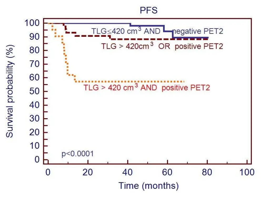 Interestingly combining TLG41% and interim PET brings out 3 distinctive prognostic categories (p<0.0001): negative PET2 and low TLG41% with good outcome (5y-PFS=92%, n=60); positive PET2 and high TLG41% with bad outcome (5y-PFS=57%, n=21) and an intermediate category (5y-PFS=88%, n=43) cf. KM curve. No progression was observed in the 8 patients with a positive interim PET but a low baseline TLG41%, suggesting that TLG41% results may reduce the numbers of false positive PET2 patients.