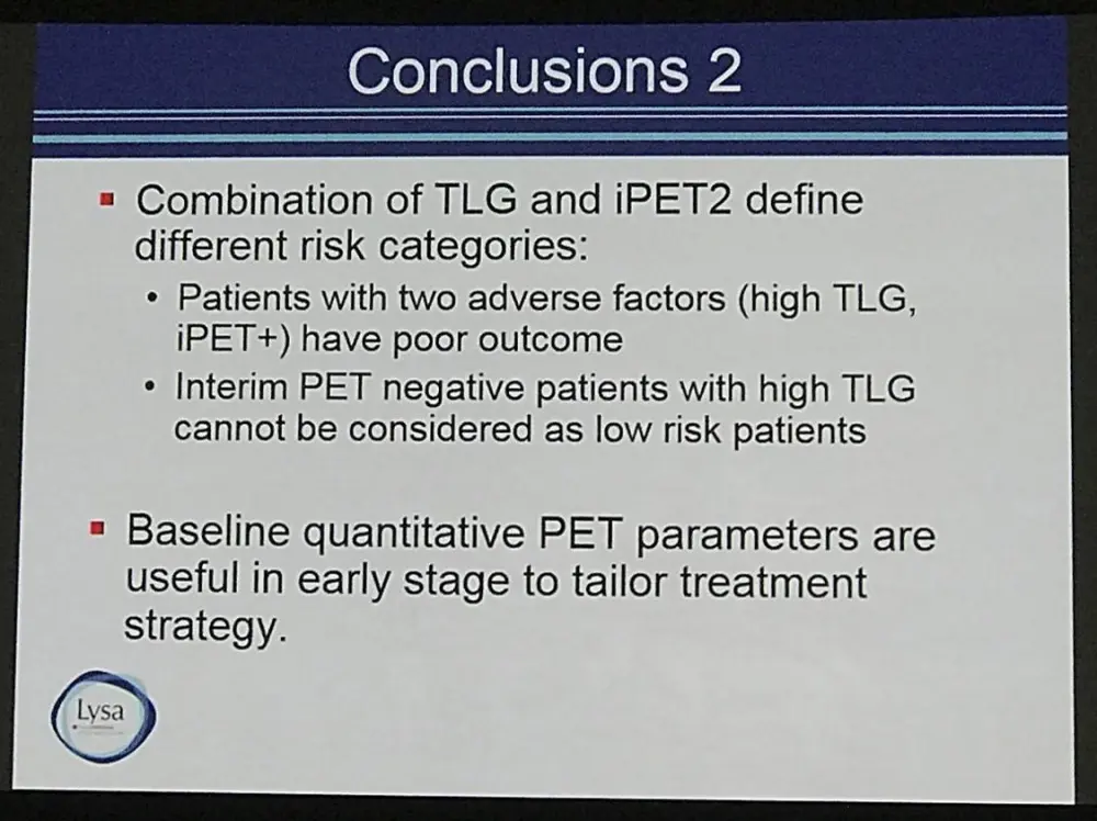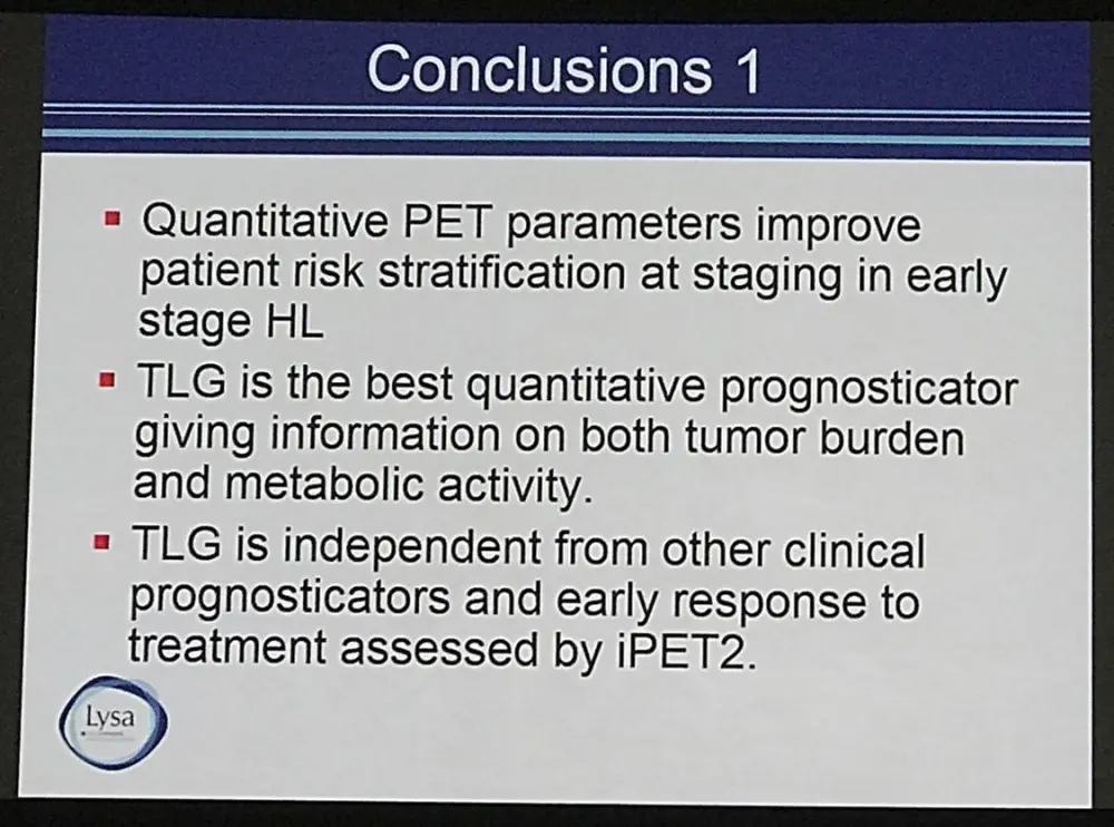 Anne Ségolène Cottereau concluded by suggesting that including TLG41% status in prognostic may decrease the false positive rate of PET2. Furthermore, TLD was suggested to be an independent prognostic indicator in early stage HL and could be used to target treatment intensification.