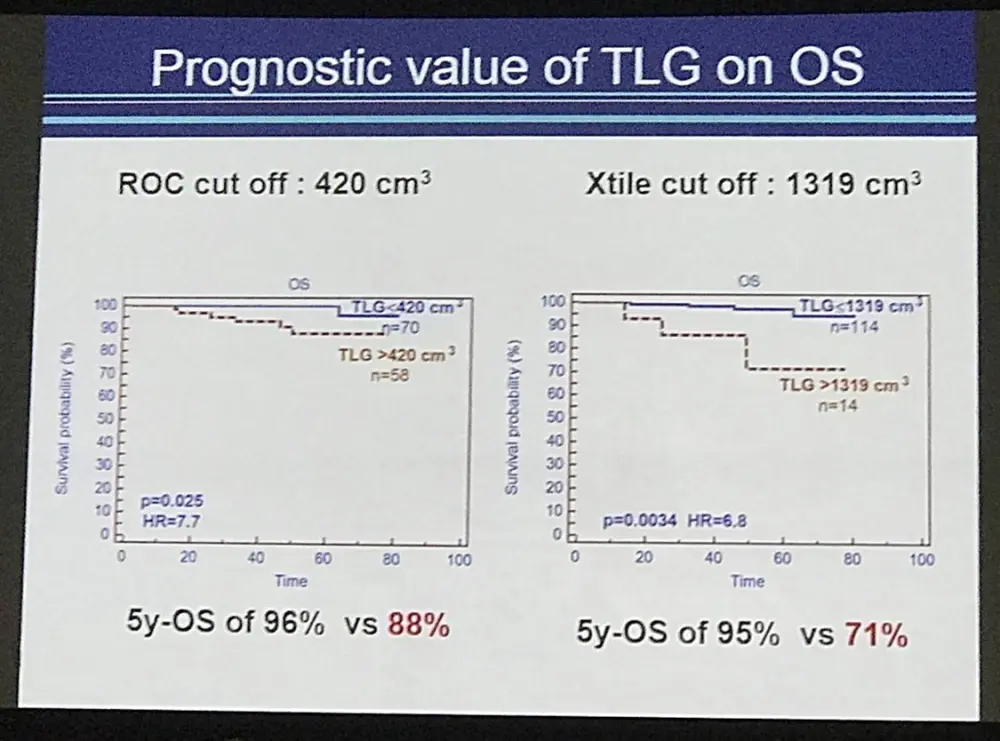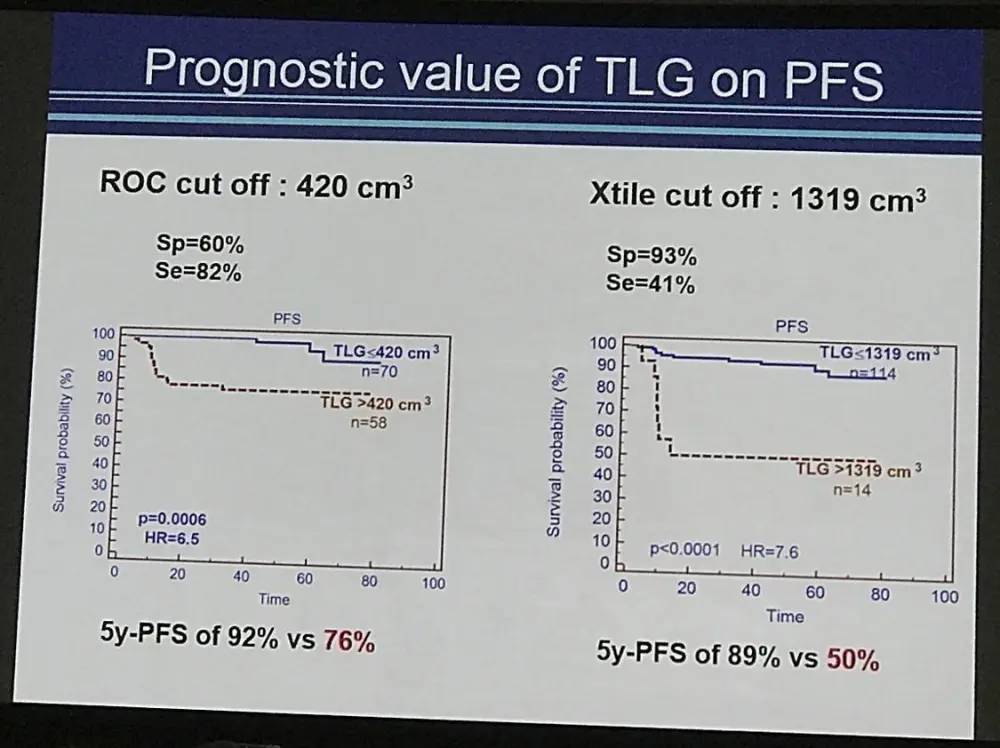 The strongest PET quantitative parameter to predict outcome was the TLG41% (p=0.0006 HR=6.5 for PFS with a cut off of 420 cm3, p=0.025 HR=7.7 for OS with a cut off of 584 cm3). Patients with a high TLG41% had a 5y-PFS of 76% vs 92% (95%CI 71-81; 88-96) and a 5y-OS of 88% vs 96% (95%CI 83-92; 92-100) for those with the lower TLG41% respectively. Similar results were found using 25% SUVmax threshold (p=0.0005 HR=4.7 for PFS, p=0.0032 HR=7.9 for OS).