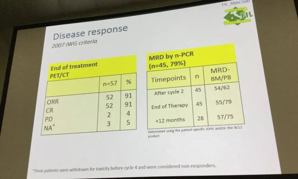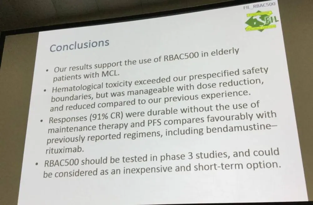 R-BAC500 regimen in patients with MCL was safely administered as first-line therapy and highly effective with 93% FDG-PET negative CR, and a 2-year PFS of 81% without maintenance therapy. During this oral presentation, it was concluded that hematologic toxicity is substantially reduced with the R-BAC500 regimen and it compares favorably with other regimens including R-bendamustine.