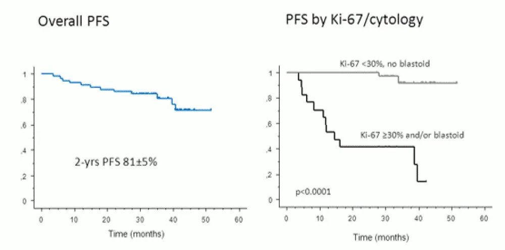 Results: From May 2012 to February 2014, 57 patients with MCL from 29 centers were recruited and treated. Central pathology revision was performed in 87% of cases. Median age was 71 years (range 61-79), 75% were males, and 91% had Ann Arbor stage III/IV disease. Mantle Cell International Prognostic Index (MIPI) was low in 15%, intermediate in 40%, high in 45%, Ki-67 was ≥30% in 31%, and 9% had the blastoid cytological variant. Overall, 53 patients (91%) received at least 4 cycles, while 36 (63%) had 6 cycles (median 5.3 cycles per patient). Fifteen patients (26%) discontinued treatment before reaching cycle 6 because of toxicity/adverse events, that mainly consisted of prolonged hemato-toxicity between cycles. Only one patient discontinued due to progressive disease. Grade 3 or 4 neutropenia and thrombocytopenia were observed in 49% and 52% of administered cycles, respectively. Febrile neutropenia occurred in 6% of cycles. Extra-hematologic toxicity was mainly cardiac (5%). Overall response rate was 96%, and CR was 93%. The MR rate at the end of treatment was 76% on peripheral blood and 55% on bone marrow (BM) samples. With a median follow-up of 34 months (28-52), the 2-years PFS (± confidence interval) was 81%±5% and the OS 85%±4%. Elevated Ki-67 (≥30%), and the blastoid variant were the strongest independent predictors of adverse PFS. Patients with either of these two features (33%), had a significantly inferior PFS (41% vs 97% after 34 months) compared to patients with classical/pleomorphic variants and low proliferative index (p<0.0001, Figure 1).