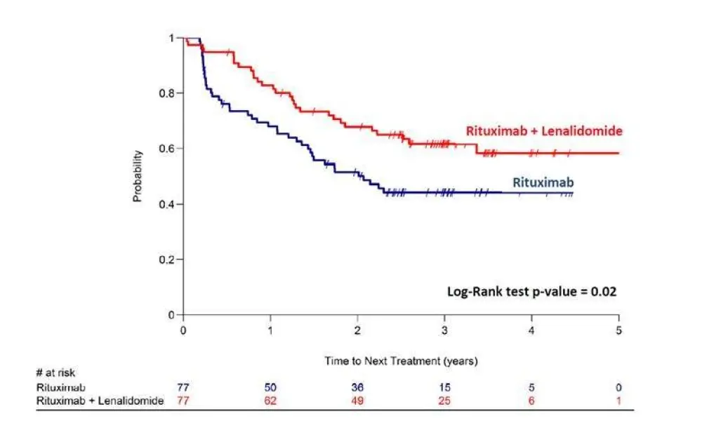 SAKK 35/10 is a randomized, phase II trial by the Swiss Group for Clinical Cancer Research (SAKK) and the Nordic Lymphoma Group (NLG) comparing single-agent rituximab and rituximab plus lenalidomide as first-line treatment for symptomatic grade 1–3a FL. During this talk, the first analysis of PFS, Time To Next Anti-Lymphoma Treatment (TTNT), CR duration, and CR/CRu rate at 30 months (CR30) was presented. Seventy-seven patients with a median age of 63 years, 52% with stage IV and 47% with poor-risk FLIPI score, were assigned to the single-agent rituximab arm. A further 77 patients with a median age of 61 years, 48% stage IV and 47% poor-risk FLIPI score, were allocated to the combination arm.