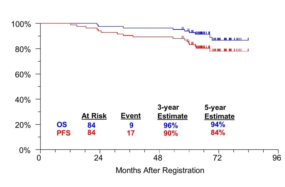After median follow-up of 5.6 years (range 3-7 years), 17 events have occurred including 9 pts experiencing progressive FL resulting in a progression free survival of 90% (95% CI: 81.9%, 95.1%) at 3 years and 84%(95% CI: 74.5%, 90.6%) at 5 years (Figure). Three-year overall survival is 96% (95% CI: 89.3%, 98.8%) and 5-year overall survival is 94% (95% CI: 86.2%, 97.5%).