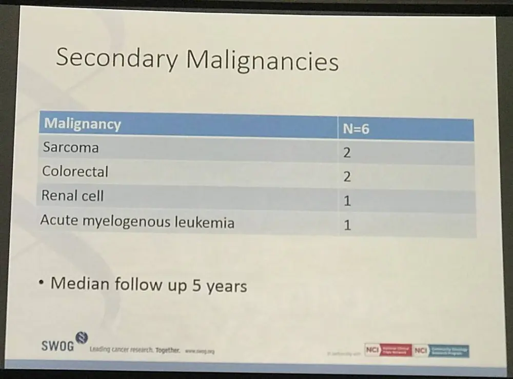 Four additional secondary malignancies were reported following completion of therapy including solid tumors (3 pts) and AML (1 pt). To date, 9 deaths have occurred due to secondary malignancies (3 pts), unknown etiology (3 pts), cardiac arrest (2 pts) and non-alcoholic cirrhosis (1 pt).