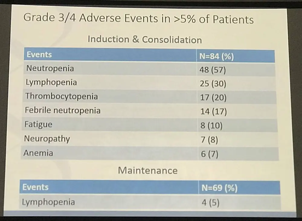 Sixty nine eligible patients registered to maintenance therapy with 42 completing the 4 year treatment plan. The only grade ≥3 AE that occurred in ≥5% of pts was leukopenia (5%). Twenty-seven pts discontinued maintenance therapy, including 11 in the first 2 years and 16 in the last 2 years, due to the following reasons: infection (8 pts), patient preference (8 pts), deaths (2 pts), treatment delay (2 pts), secondary solid tumors (2 pts), bowel perforation (1 pt), joint pain (1 pt), hepatic transaminase elevation (1 pt), insurance refusal (1 pt), and dose error (1 pt).