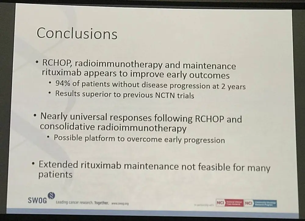 Paul Barr concluded by stating that this strategy of MR after RIT resulted in 2 year PFS of 94%, improving early outcomes, but that MR for 4 years may be unfeasible given the discontinuation rates and that given these results future studies should look at combining strong chemoimmunotherapy with RIT.