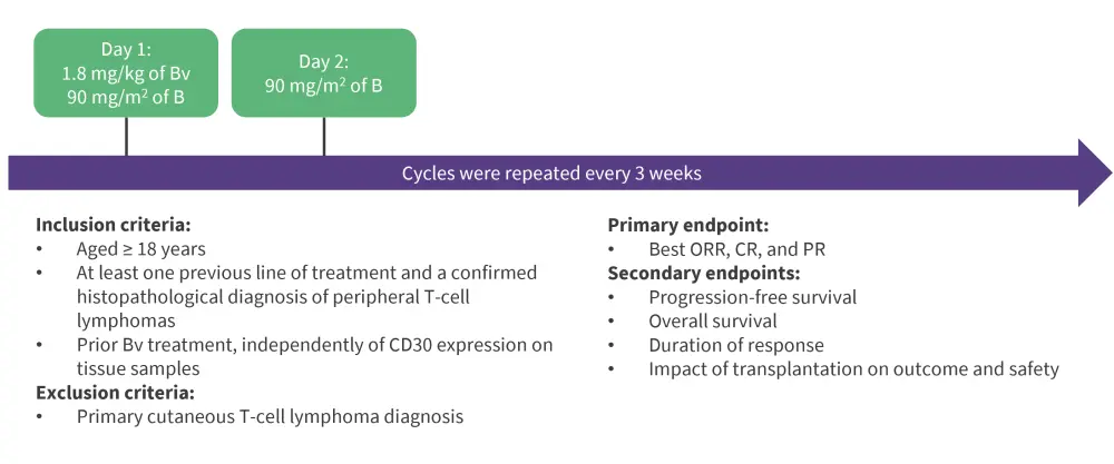 B, bendamustine; BBv, bendamustine and brentuximab-vedotin; Bv, brentuximab-vedotin; CR, complete response; ORR, overall response rate; PR, partial response; PTCL, peripheral T-cell lymphomas.