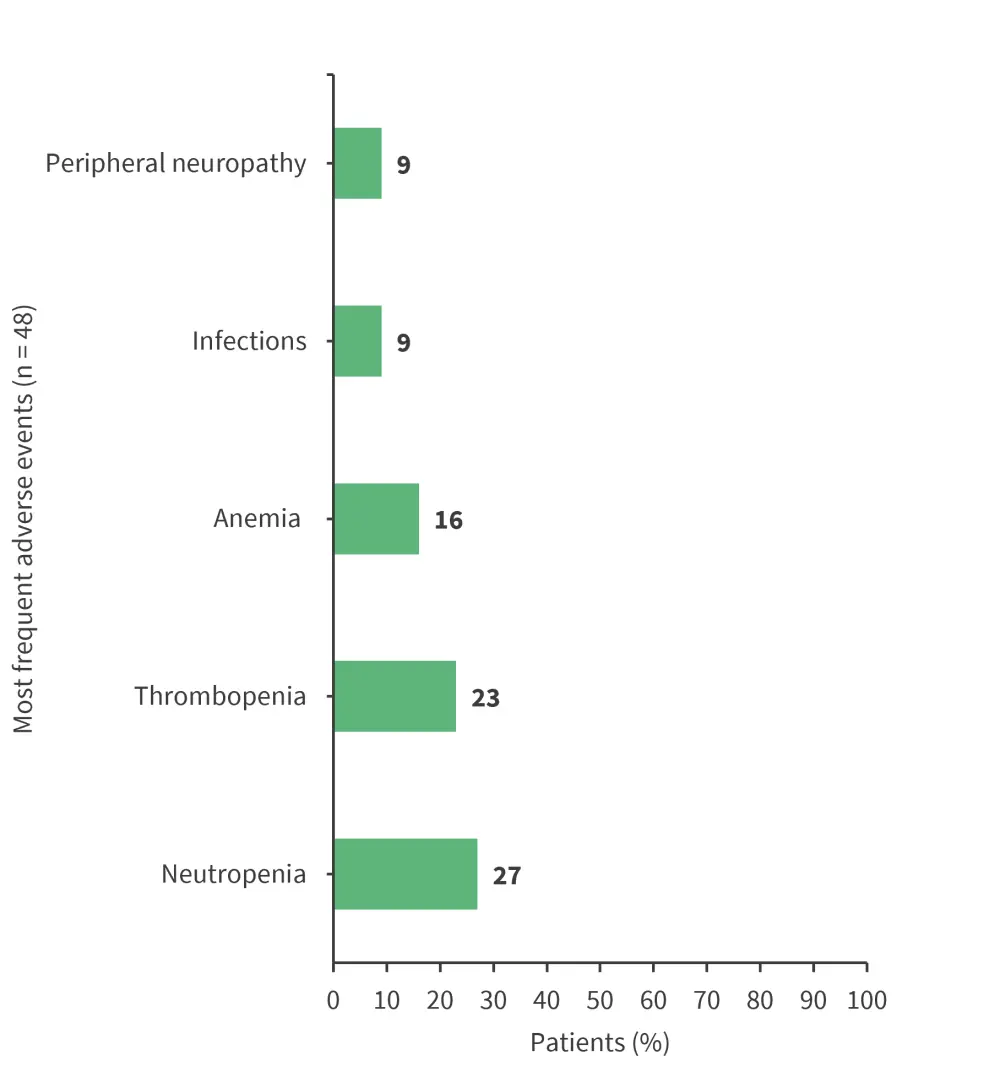 Grade 3 to 4 adverse events were reported in 59% of patients. The most frequent adverse events were hematologic, infectious, and neurologic toxicities, as shown in Figure 4. Doses had to be reduced in 33% of patients, mainly due to hematologic toxicities, neurotoxicity, rash, and gastrointestinal toxicity. Treatment had to be stopped early in 11% of patients due to hematologic toxicity and neurotoxicity.
