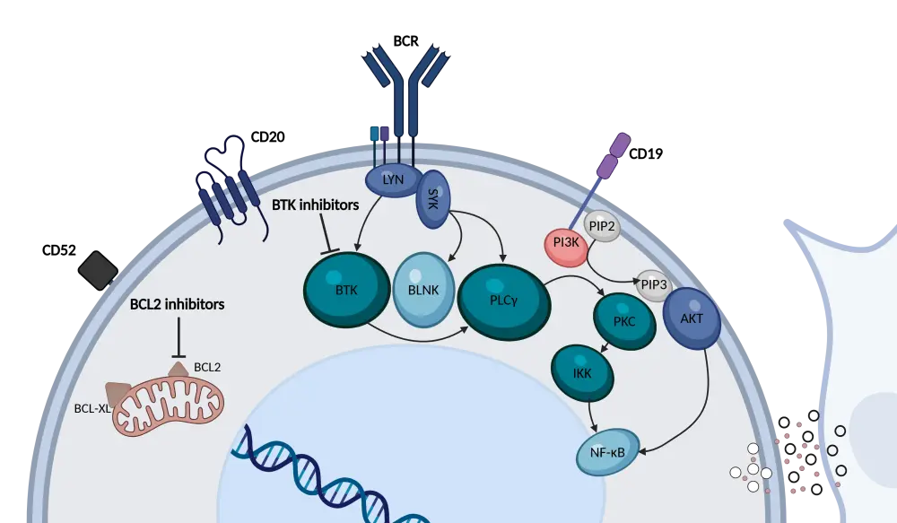 B-cell receptor (BCR) signaling is a key driver of CLL pathogenesis, and BTK is a vital component of this pathway.3,4 In patients with CLL, BTKi can disrupt the BCR signaling cascade by binding to the BTK enzyme (Figure 1).3 Besides directly inhibiting BTK signaling, BTKi can also interact with several off-target kinases, such as epidermal growth factor receptor (EGFR), ErbB2, interleukin-2-inducible T cell kinase (ITK), and tyrosine kinase expressed in hepatocellular carcinoma (TEC).4 While these off-target effects likely contribute to the anti-CLL activity, they can also be associated with adverse events (AEs).4 In addition, BTKi can exert immunomodulatory effects within the CLL microenvironment, as BTK is expressed in non-leukemic cells.3,4 The Lymphoma Hub previously published an in-depth review of ibrutinib’s mechanism of action in CLL.