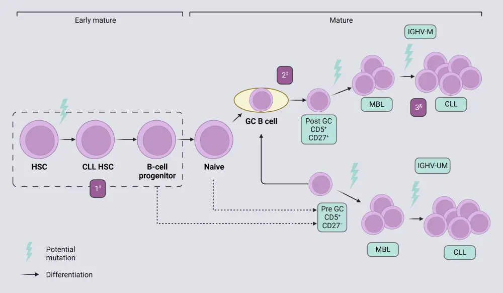CLL, chronic lymphocytic leukemia; GC, germinal center; HSC, hematopoietic stem cell; IGHV-M, immunoglobulin heavy chain variable region-mutated; IGHV-UM, IGHV-unmutated; IMBL, monoclonal B-cell lymphocytosis.