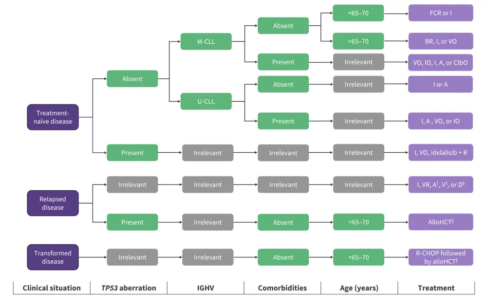 A, acalabrutinib; AlloHCT, allogeneic hematopoietic cell transplantation; BR, bendamustine + rituximab; ClbO, chlorambucil + obinutuzumab; D, duvelisib; FCR, fludarabine + cyclophosphamide + rituximab; I, ibrutinib; IGHV, immunoglobulin heavy-chain variable region; IO, ibrutinib + obinutuzumab; M-CLL, mutated IGHV; R, rituximab; R-CHOP, rituximab, cyclophosphamide, doxorubicin, vincristine and prednisone; U-CLL, unmutated IGHV; V, venetoclax; VO, venetoclax + Obinutuzumab; VR, venetoclax + rituximab.