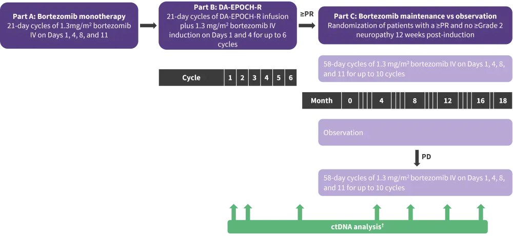 †Research samples including serum for ctDNA were collected at protocol-defined timepoints including pretreatment, after the bortezomib window, after cycles one and two of induction therapy, at the end of induction, and at each follow-up visit.