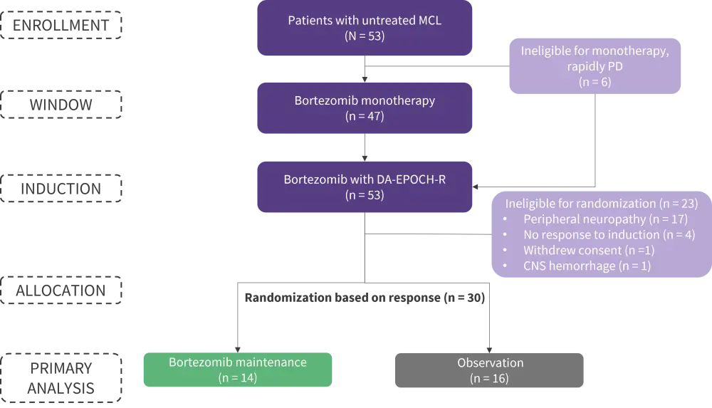 CNS, central nervous system; DA-EPOCH-R, dose-adjusted etoposide, prednisone, vincristine, cyclophosphamide, doxorubicin, and rituximab; MCL, mantle-cell lymphoma; PD, progressive disease.