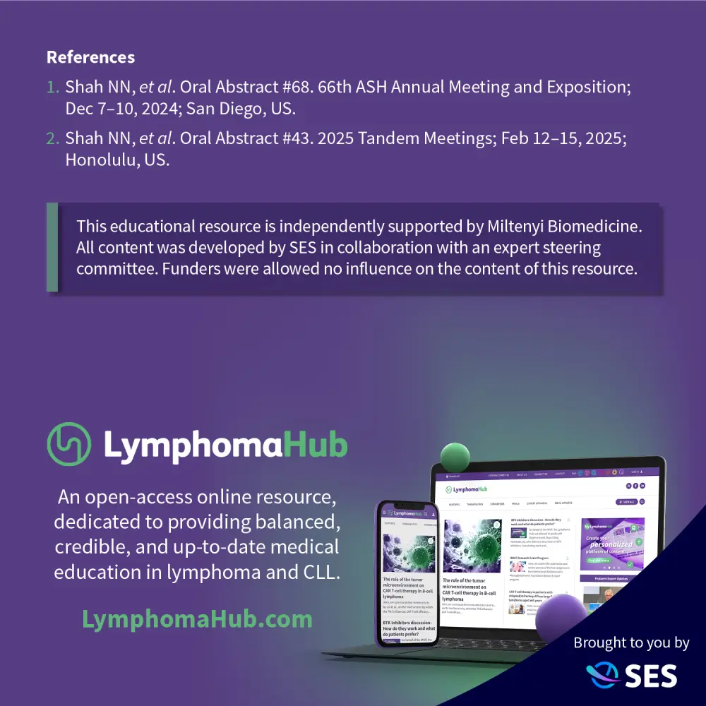 The Lymphoma & CLL Hub is an independent medical education platform, sponsored by AbbVie, BeOne Medicines, Johnson & Johnson, Miltenyi Biomedicine, Nurix Therapeutics, Roche, Sobi, and Thermo Fisher Scientific and supported through educational grants from Bristol Myers Squibb, Lilly, and Pfizer. Funders are allowed no direct influence on our content. The levels of sponsorship listed are reflective of the amount of funding given. View funders.
