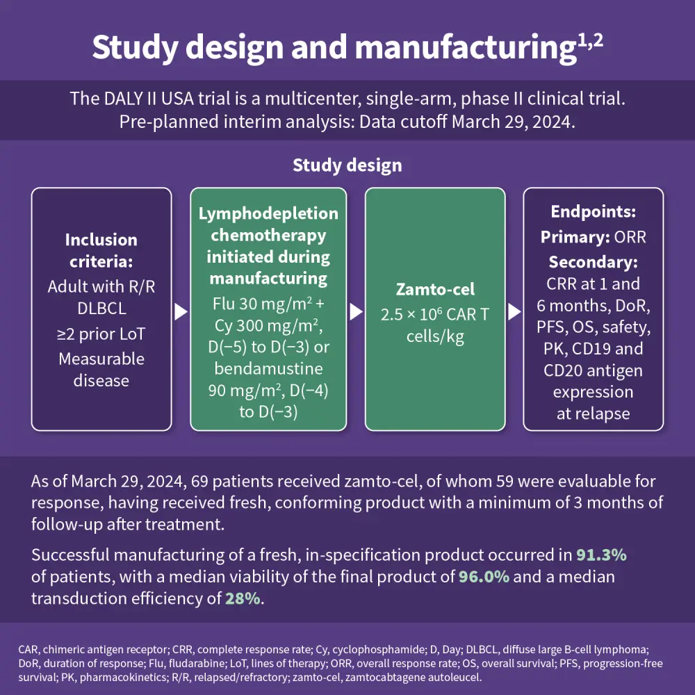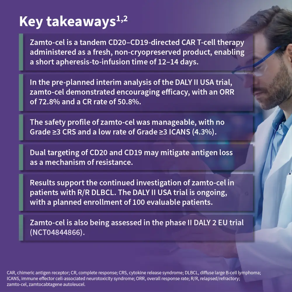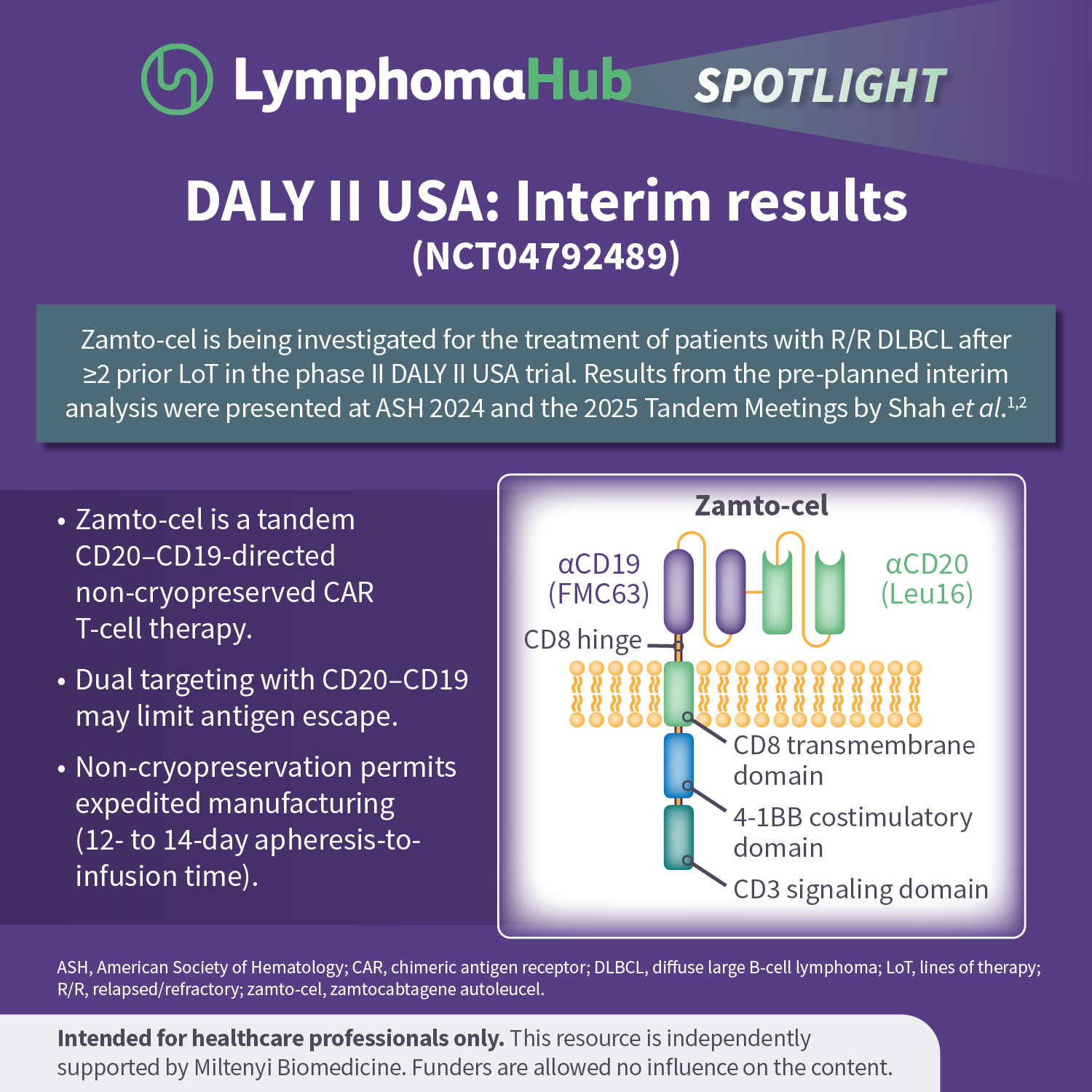 Zamtocabtagene autoleucel (zamto-cel) is a tandem CD20-CD19-directed non-cryopreserved chimeric antigen receptor (CAR) T-cell therapy that can be administered as a fresh product with a short apheresis-to-infusion time of 12–14 days.1,2 The ongoing multicenter, open-label, phase II DALY II USA trial (NCT04792489) is evaluating the efficacy and safety of zamto-cel in patients with relapsed/refractory (R/R) diffuse large B-cell lymphoma (DLBCL) after ≥2 prior lines of therapy.1,2 A pre-planned interim analysis was conducted in 2024, with results presented by Nirav Shah at the Transplant & Cellular Therapy Meetings of ASTCT and CIBMTR (2025 Tandem Meetings) on Feb 12–15, 2025, in Honolulu, US; and the 66th American Society of Hematology Annual Meeting and Exposition, Dec 7–10, 2024, San Diego, US.1,2
