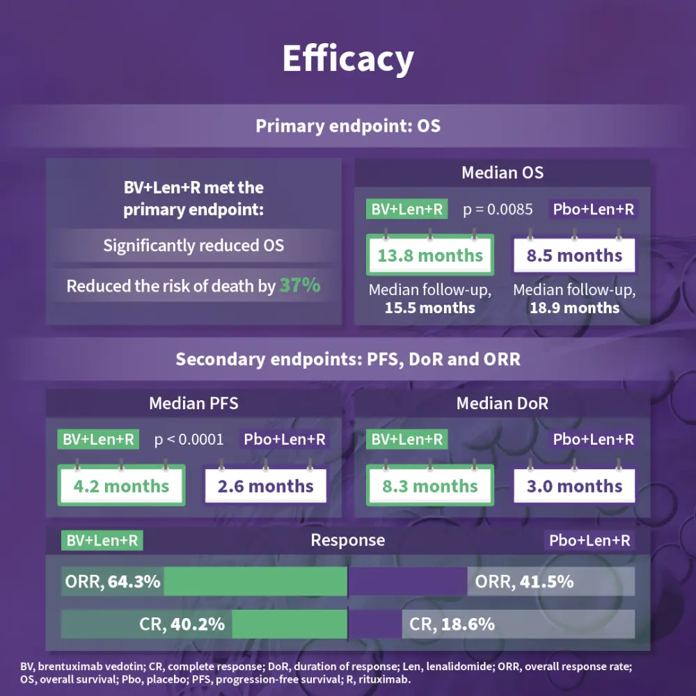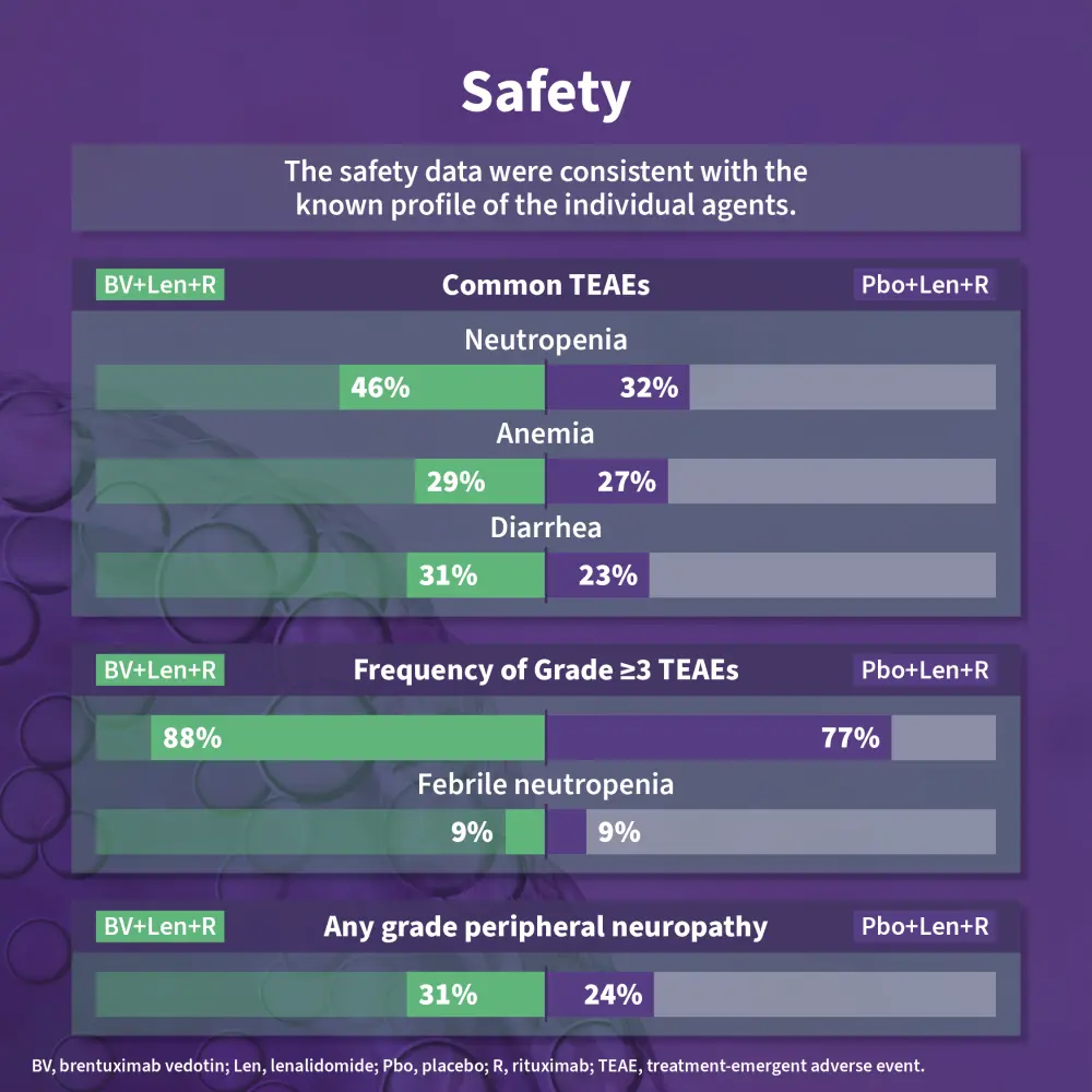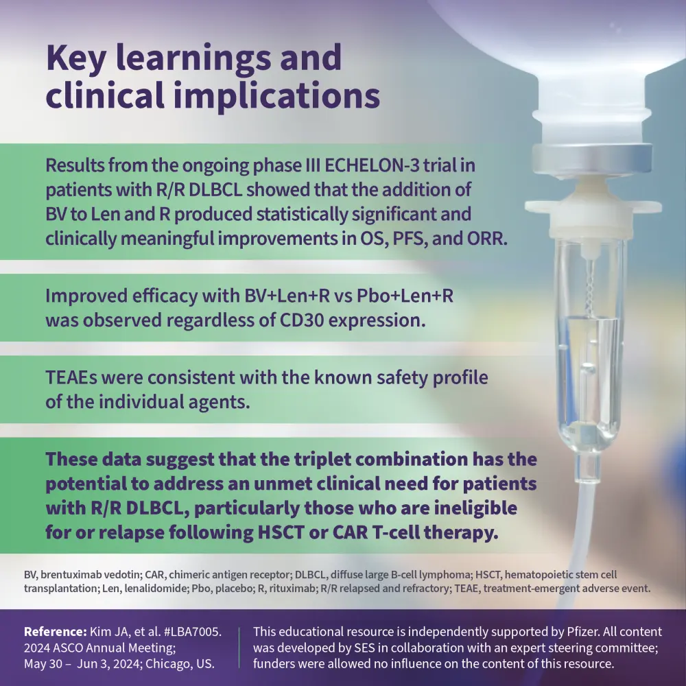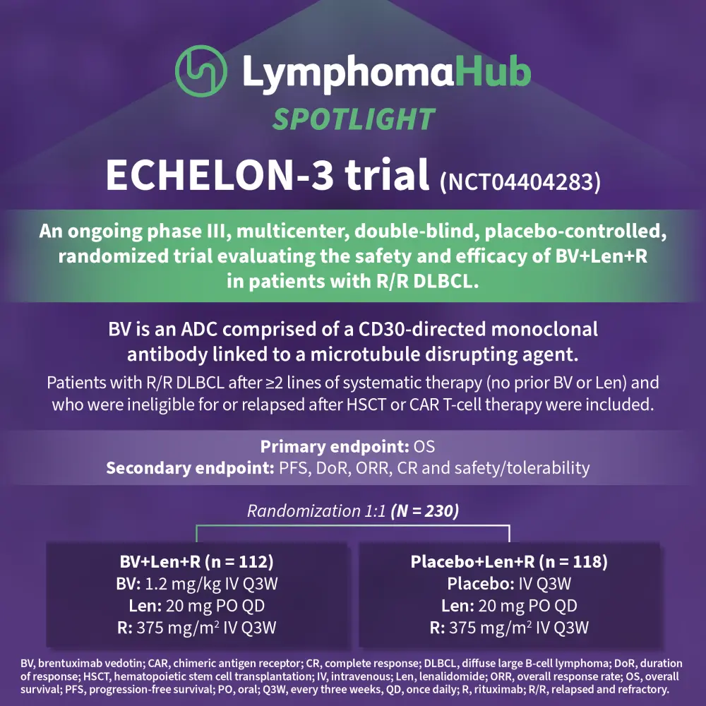 The phase III ECHELON-3 trial (NCT04404283) assessed the efficacy and safety of brentuximab vedotin in combination with lenalidomide + rituximab (R2) vs placebo + R2 in patients with relapsed/refractory diffuse large B-cell lymphoma (DLBCL) who received ≥2 prior lines of therapy and were ineligible for hematopoietic stem cell transplantation (HSCT) and chimeric antigen receptor (CAR) T-cell therapy.1