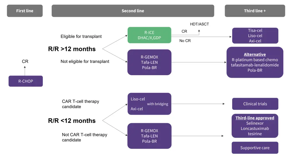 Axi-cel, axicabtagene ciloleucel; CAR, chimeric antigen receptor; CR, complete response; DHAC, dexamethasone, cytarabine, carboplatin; GDP, gemcitabine, dexamethasone, and cisplatin; liso-cel, lisocabtagene-maraleucel; pola-BR, polatuzumab with bendamustine; R-ICE, rituximab, ifosfamide, carboplatin, and etoposide; R-CHOP, rituximab plus cyclophosphamide, doxorubicin, vincristine, and prednisone; R-GemOx, R-gemcitabine and oxaliplatin; R/R, relapsed/refractory; tafa-len, tafasitamab plus lenalidomide; tisa-cel, tisagenlecleucel.